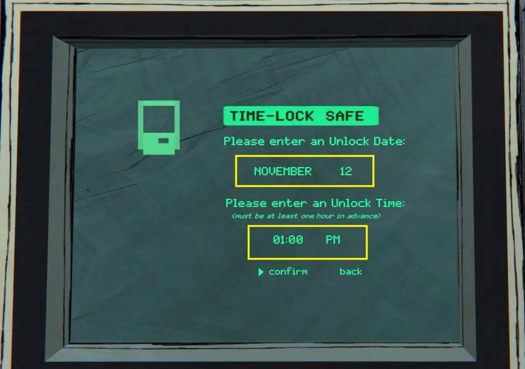 To open the safe, you need to use the computer to set the right date and time. If you choose correctly, the safe will stay unlocked starting from that time.