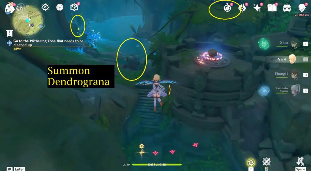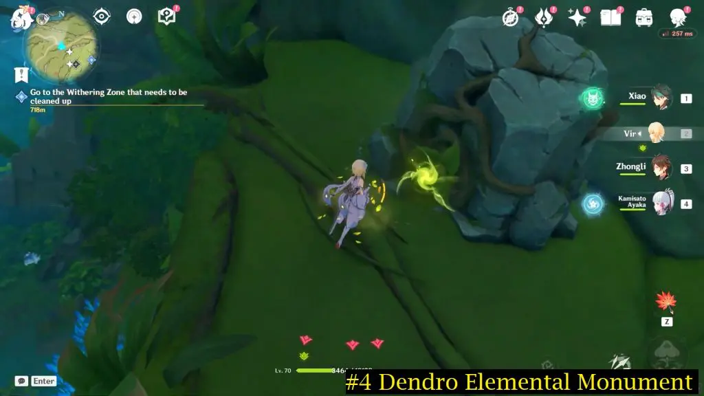 First, summon Dendrograna and then activate the third Dendro Elemental Monument concealed beneath a root-wrapped rock.
