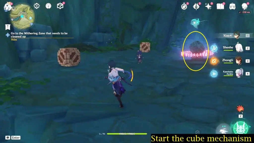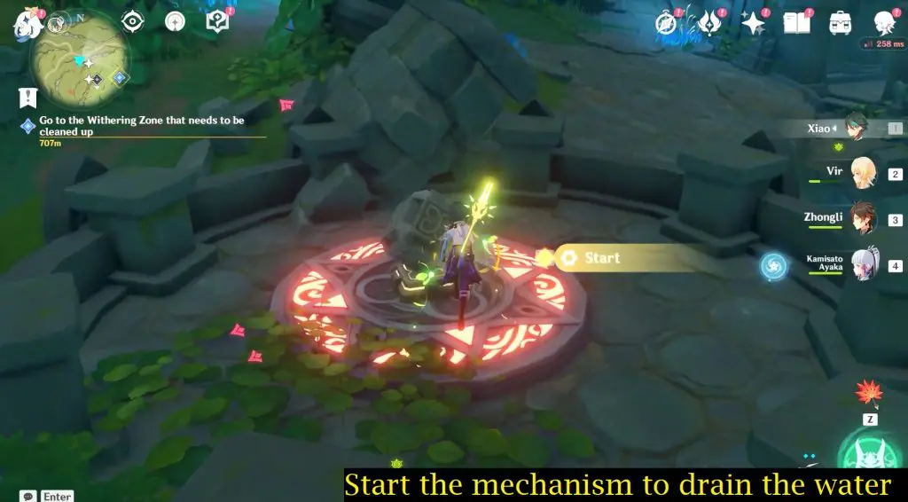 When all four Dendro Elemental Monuments have been activated, proceed to the cube mechanism and interact with it to start. This will drain the water completely.