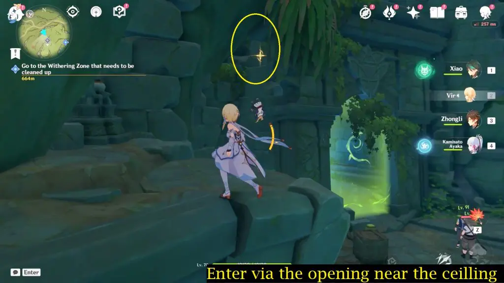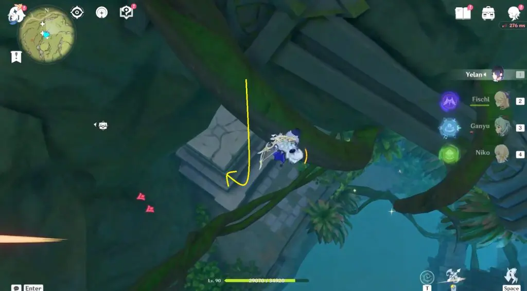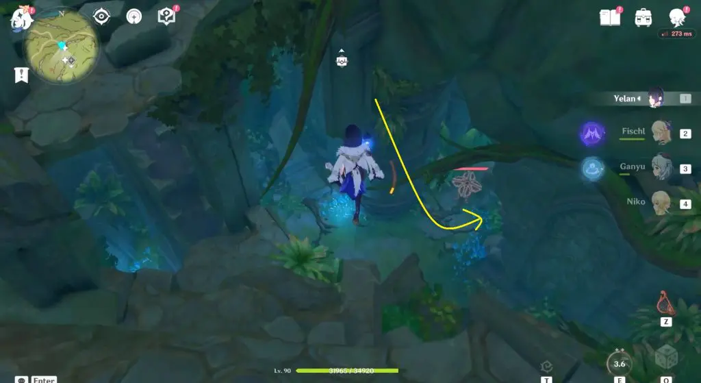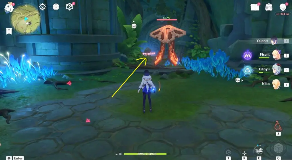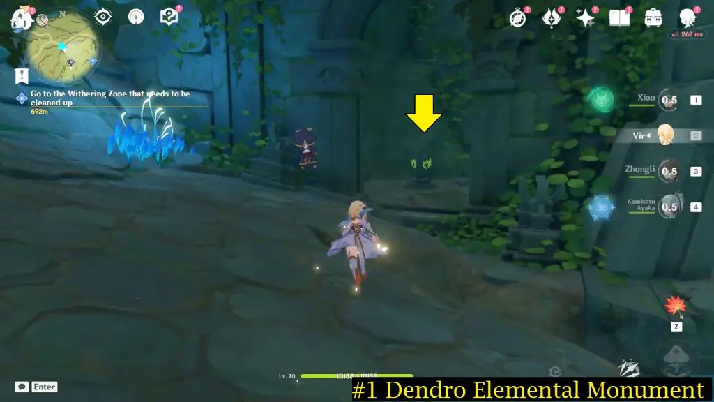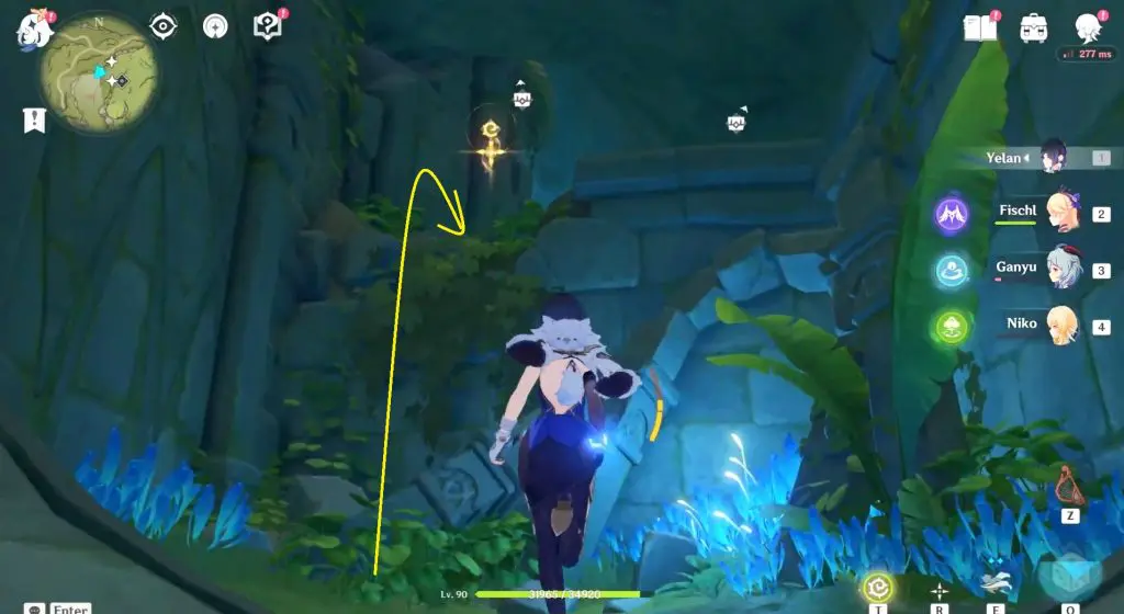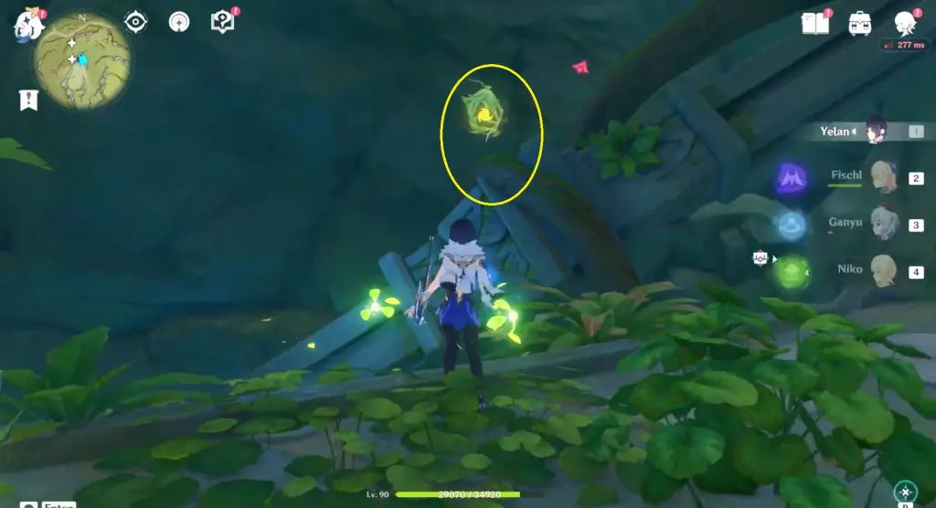 Next, head inside the cave and continue to follow the path until you reach a bigger area. Inside you need to activate four Dendro Elemental Monuments. You need to use a Dendro character such as Collie or Tighnari or Traveler to light up these Elemental Monuments.