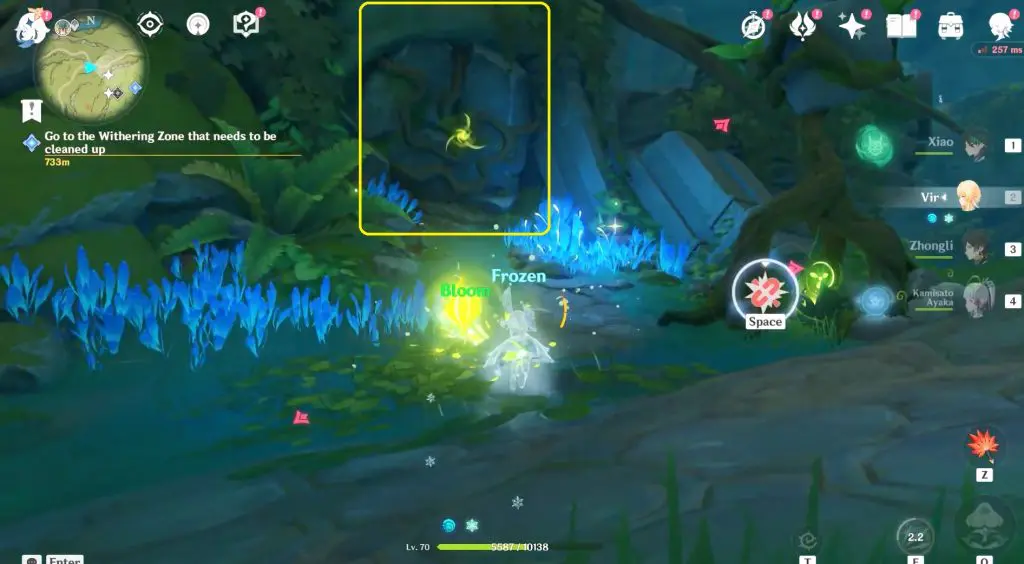 Glide to the middle section, as indicated in the image below. You’ll come across a massive rock covered in roots. Hit the rock to clear the roots and activate the Dendrograna. You can use it to summon Dendrograna.