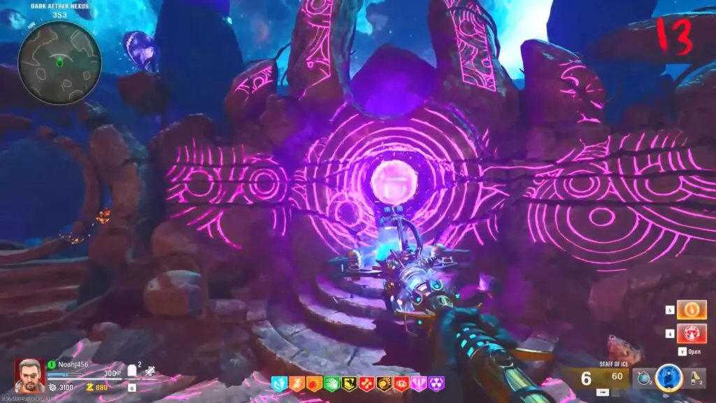 Go to the Dark Aether Nexus and look up at the sky. You’ll see three symbols on floating rocks—shoot them with the Ice Staff to bring the rocks lower. Remember all three symbols as these symbols will change in each game.