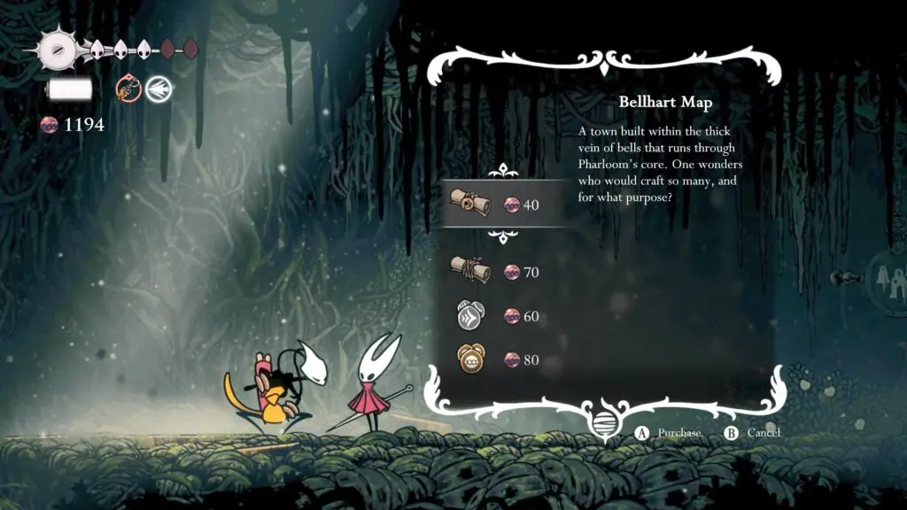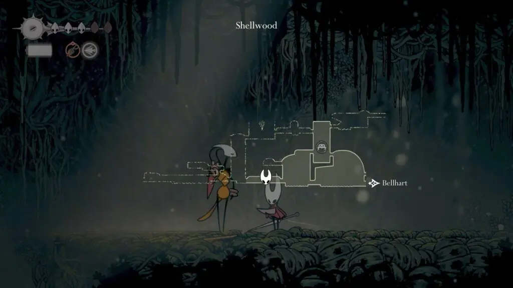 Once inside, make your way upward and follow the winding path until you reach the western edge of Shellwood. Here, you’ll find the merchant Shakra, who sells maps of both Shellwood and Bellhart.