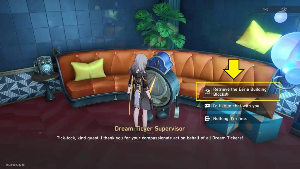 Speak with the Dream Ticker Supervisor to learn more about it and give him Eerie Building Block if it’s in your possession already. You can give 5 of these blocks at once.