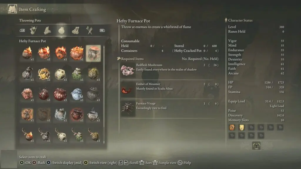 Players must collect Furnace Visages, Hefty Cracked Pot, Redflesh Mushrooms, and Embers of Messmer to craft a Hefty Furnace Pot.
