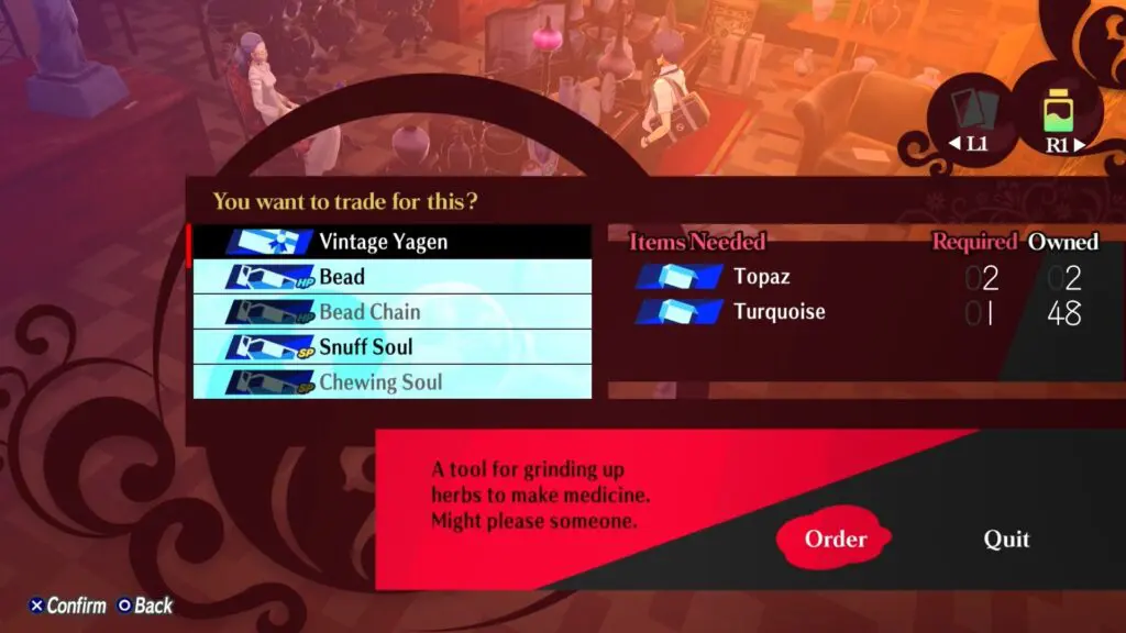 Head on over to Aohige Pharmacy in Paulownia Mall. Speak with the Pharmacy owner and He’ll tell you to bring Vintage Yagen from the antique store next door.