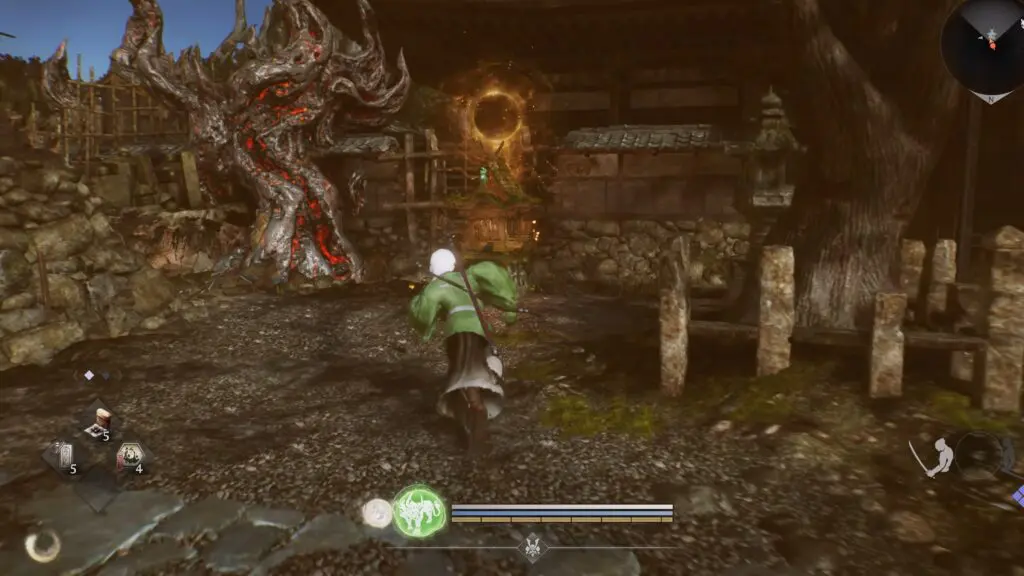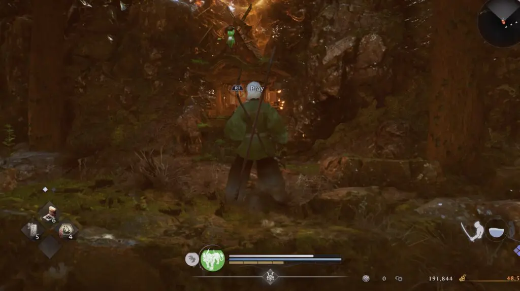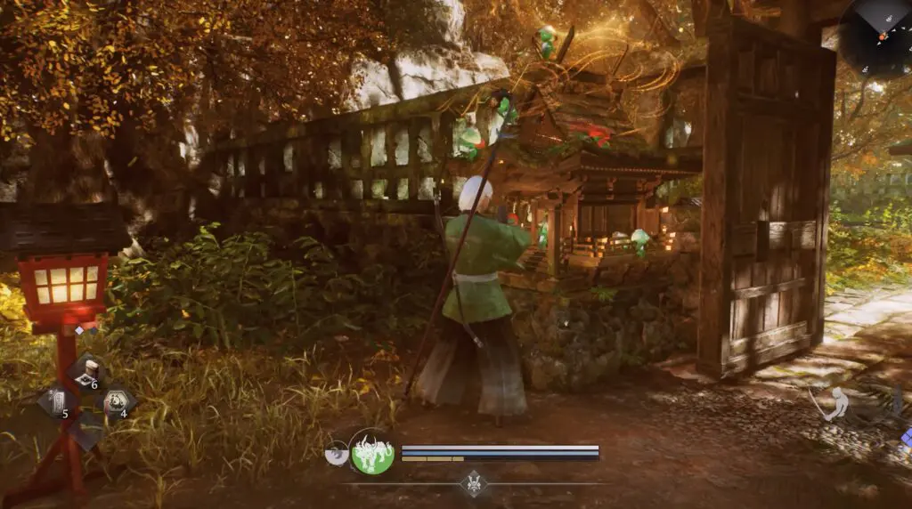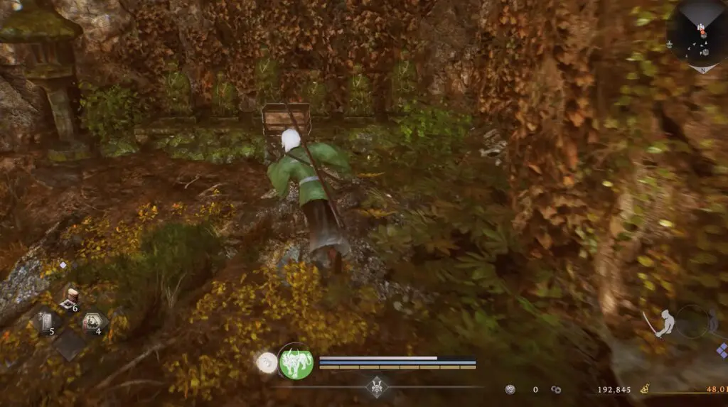 Head northeast of the Temple Ruins Cemetery Shrine to find the Kodama beside the stairs, hidden under some bamboo plants. Refer to the location on the map below.