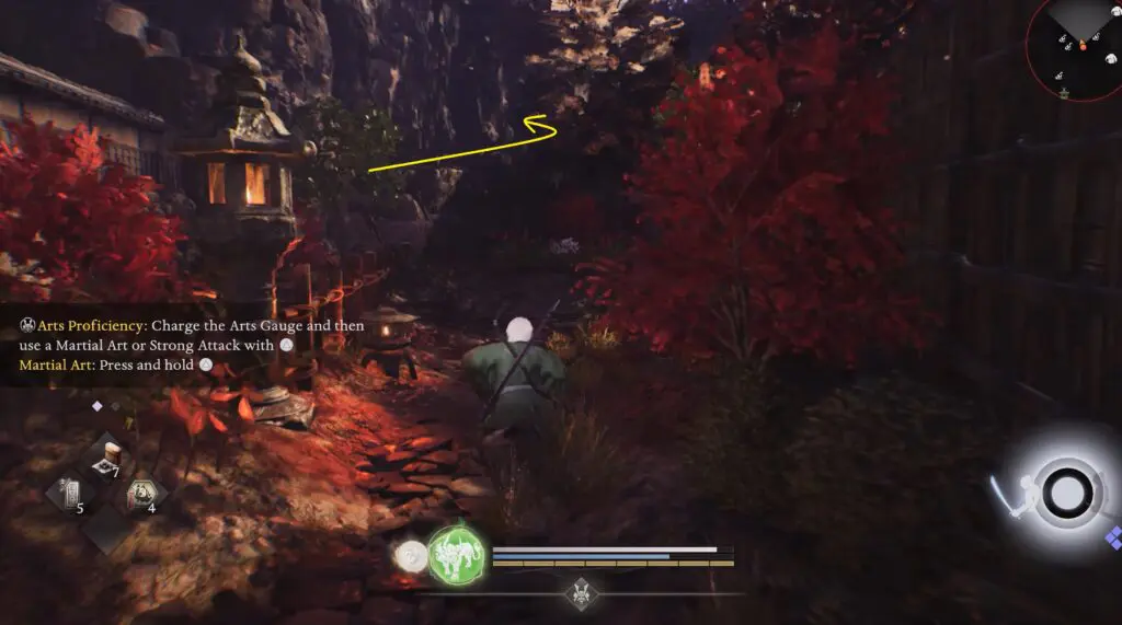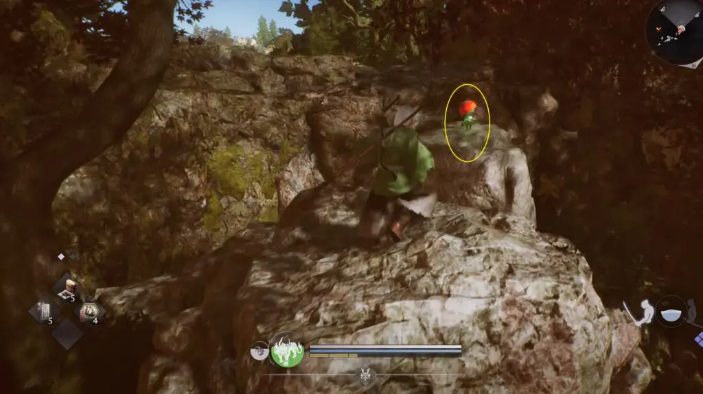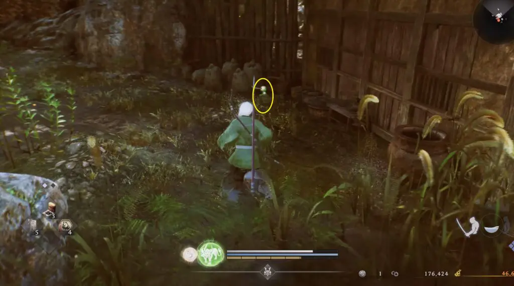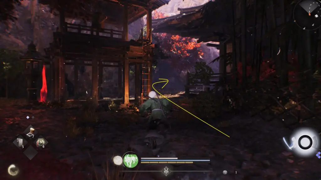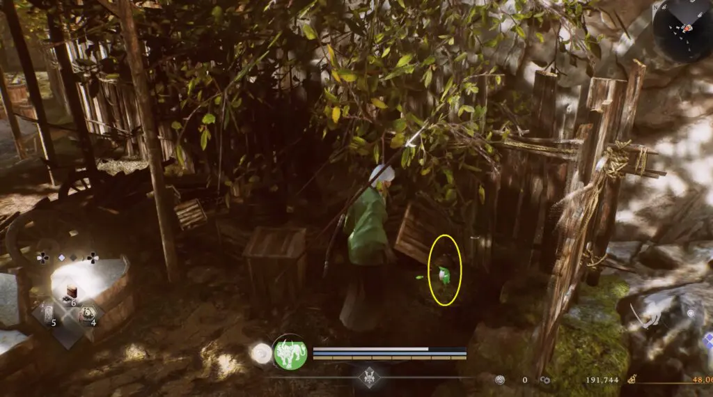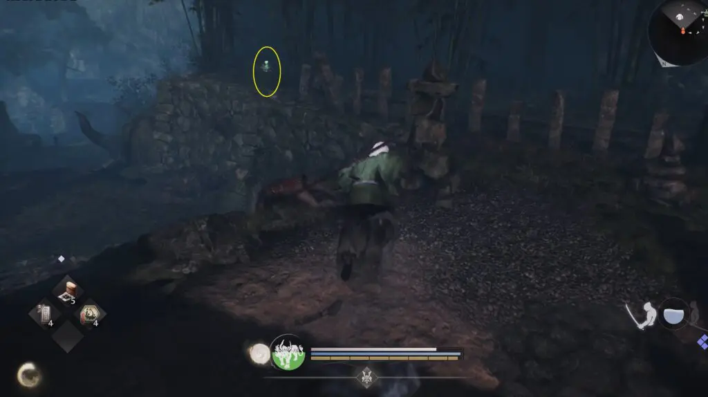 Head northeast of the Temple Ruins Cemetery Shrine to find the Kodama beside the stairs, hidden under some bamboo plants. Refer to the location on the map below.