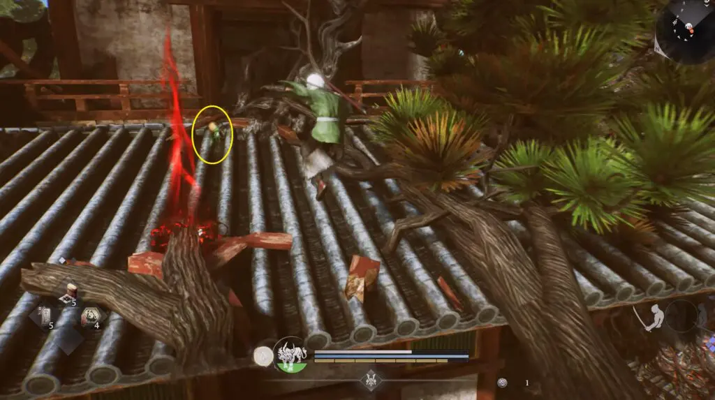 Go behind the temple and climb up the tree trunk to reach the roof, where you will find the Kodama.