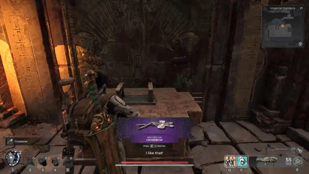 The order of placement doesn’t matter; they can be arranged vertically from top to center. After completing this step, a hidden passage behind the puzzle will open up, allowing the player to descend and claim their reward – Crossbow.