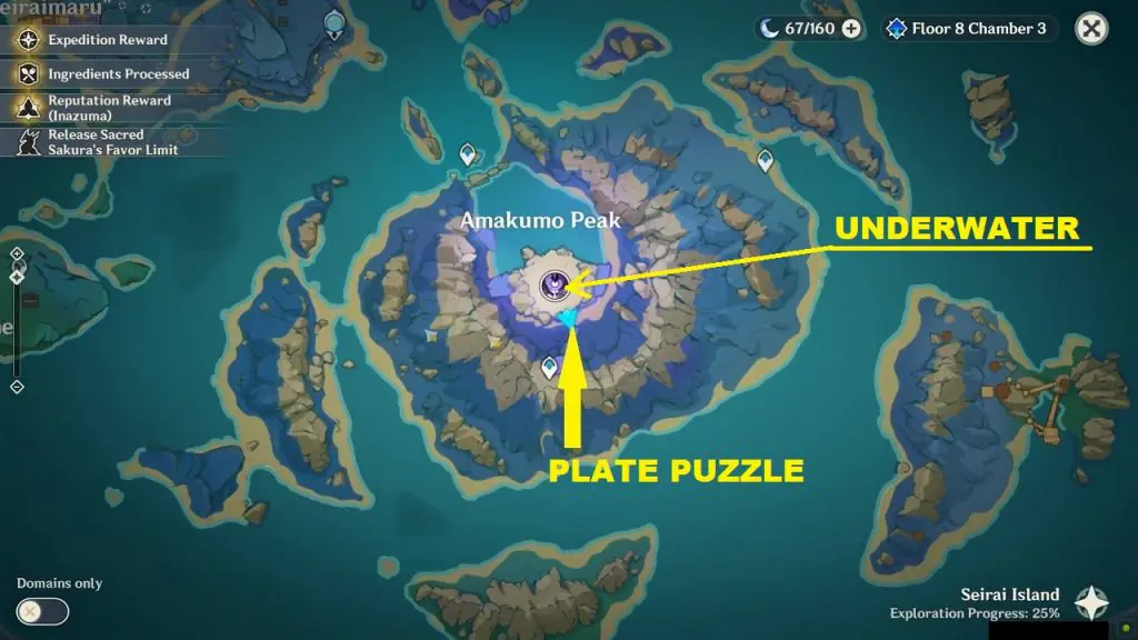 There is one Luxurious Chest near the ‘Palace in a Pool‘ domain in Suigetsu Pool. Suigetsu Pool is on the northeast side of Watatsumi island as shown in the picture below. To get the luxurious chest you will first need to drain out water from the pool. Click here to see how to drain out water from the pool.