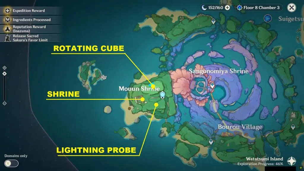 Mouun Shrine is at the western edge of Watatsumi island of Inazuma Region. On the north side of Mouun Shrine, you will find a Rotating Cube Puzzle and on the south side, you will find a Lightning Strike Probe Puzzle. Solving both the puzzles gets you a Luxurious chest.