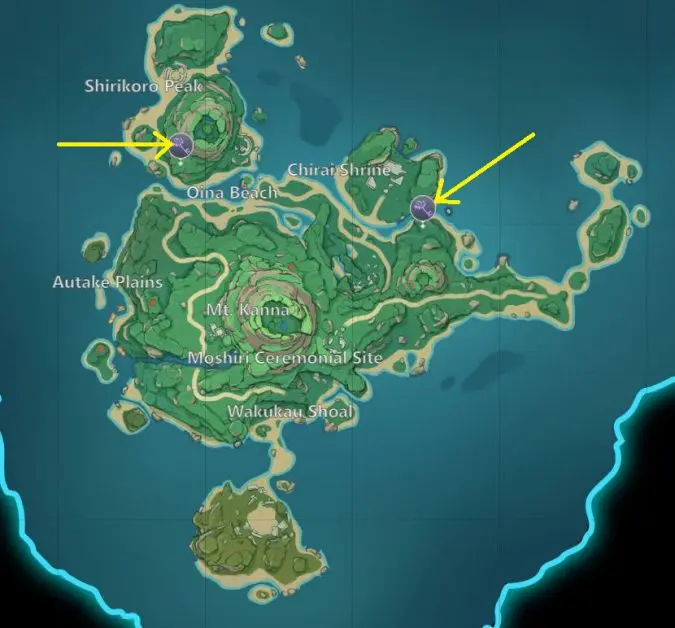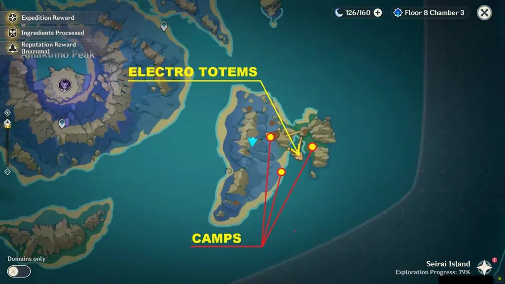 You will find three sealed electro totems at the eastern part of the small island in the southeast portion of Seirai Island. To unseal the electro totems you will need to clear three Hilicurls camps. The location of the three Hilicurls camps and electro totems is shown below.