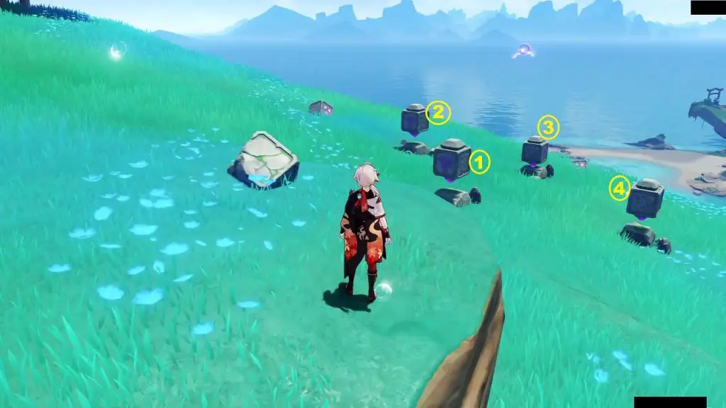 On the north side of the barrier, you will find four blocks. To solve the puzzle you will need to make the same number of feathers glow on all four blocks. Hit the middle two blocks two times each and it will make two feathers glow on all four blocks. An exquisite chest and an Electro Seelie will appear on the completion of the puzzle. Chase the Electro Seelie until it reaches the Electrograna plant.