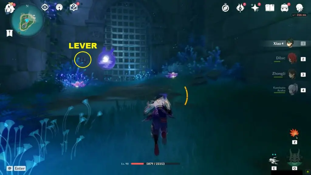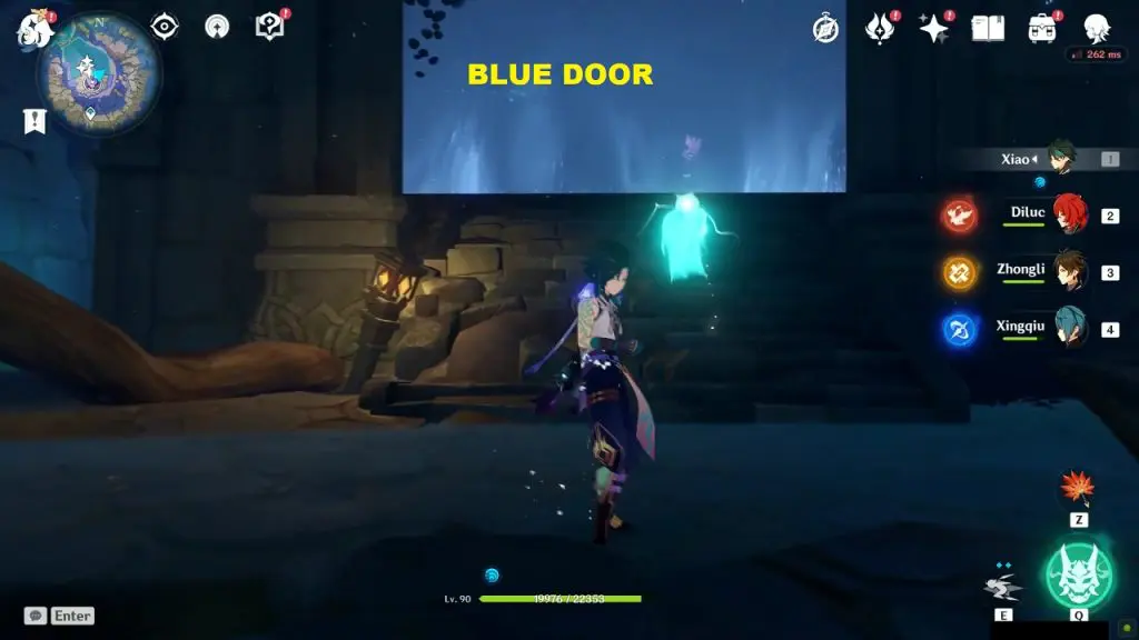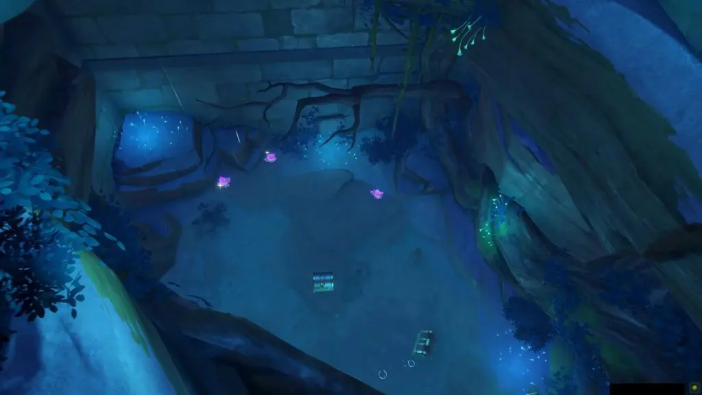 After you open the blue door, go inside the room. In this room, you will find a Luxurious chest. there will be another blue door in this room with a switch next to it as shown in the picture below. Interact with the switch to drain out the water completely. This will open the blue door as well. Draining the water will reveal a luxurious chest as the bottom. Go through the now-open blue door and jump down to reach the luxurious chest at the bottom.