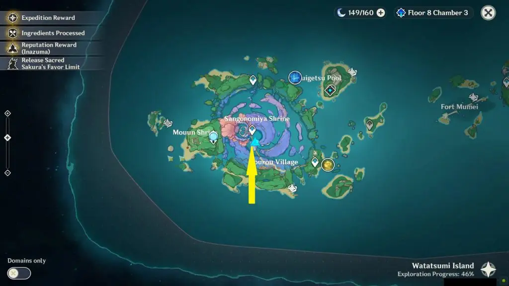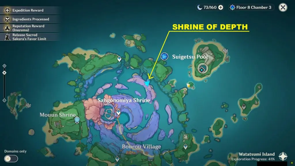 There are two Shrine of Depths on Narukami island. One is at the southeast of Chinju Forest at location as shown in the picture below. You will get a luxurious chest inside the shrine. Click here to see how to get Shrine of Depths Keys.