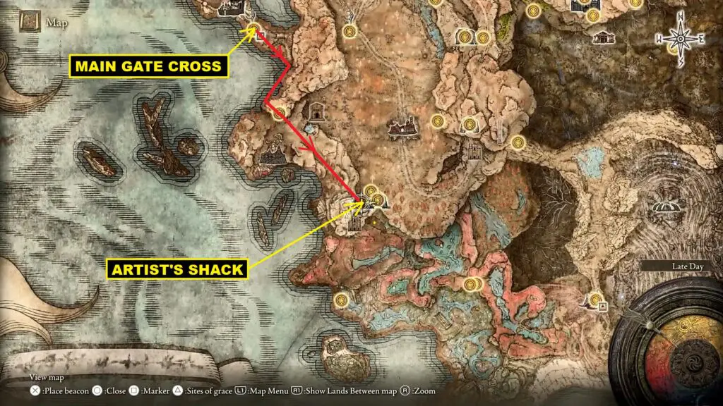 You will find the painting inside Artist’s Shack as shown in the pictures below. From the Main Gate Cross Grace Site, go south following the path marked with a red line in the map below to reach the Artist’s shack.