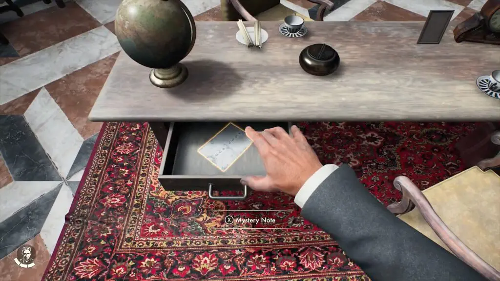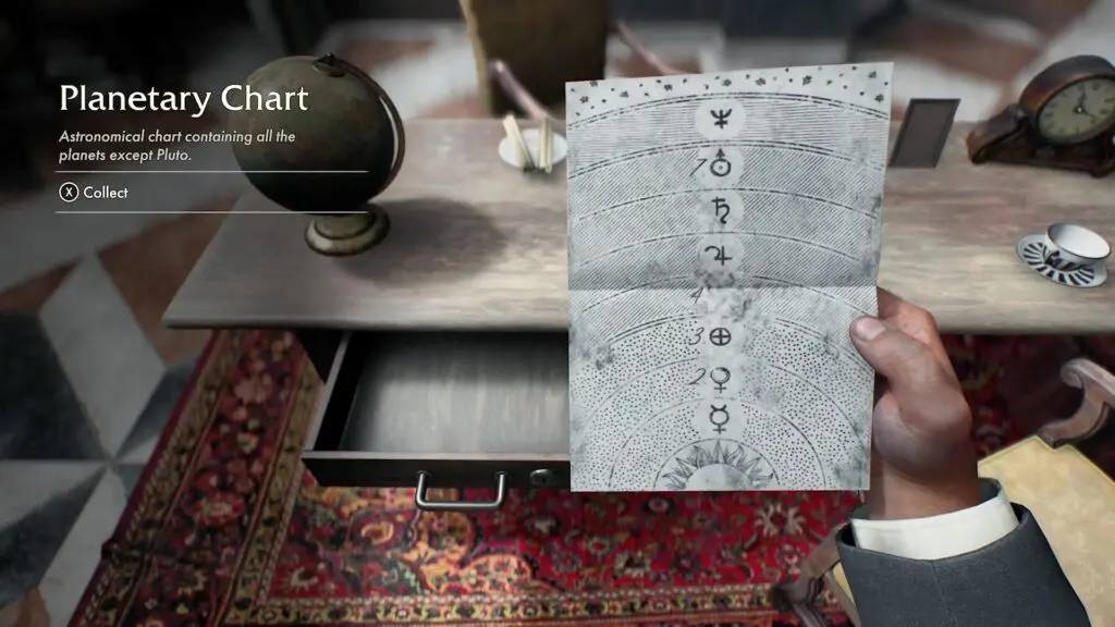 To begin, go inside the chapel, use the Clerical Key to open the door, and head upstairs and open the drawer of the table. Interact with the mystery note (Planetary Chart) to start the Secret of Secrets mystery.