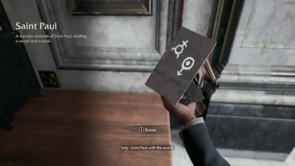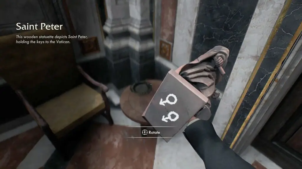 Now pick up the Peter and Paul statues from the same room and turn them upside down to see two planetary symbols painted on the bottom.