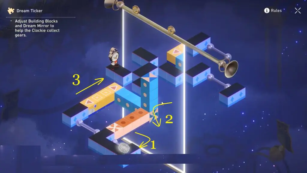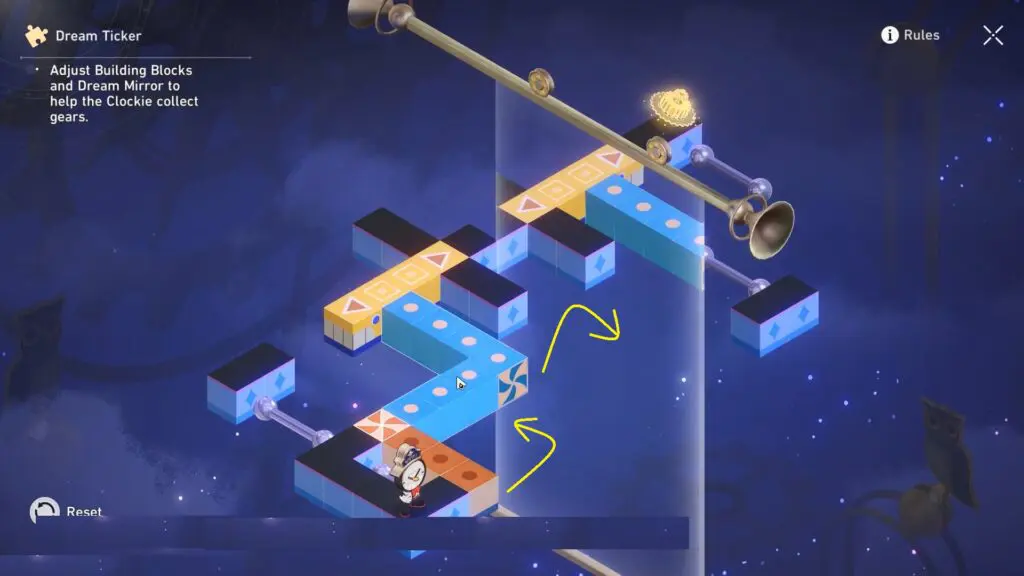 Rotate the blue block clockwise twice and then rotate the orange block anti-clockwise. Adjust the mirror if required.