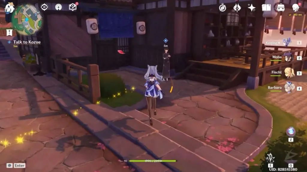 As the quest starts, your first objective will be to “Talk to Kozue”. Go to Komore Teahouse and speak with Kozue who is standing outside. She’ll tell you that Ramsay is in the teahouse.