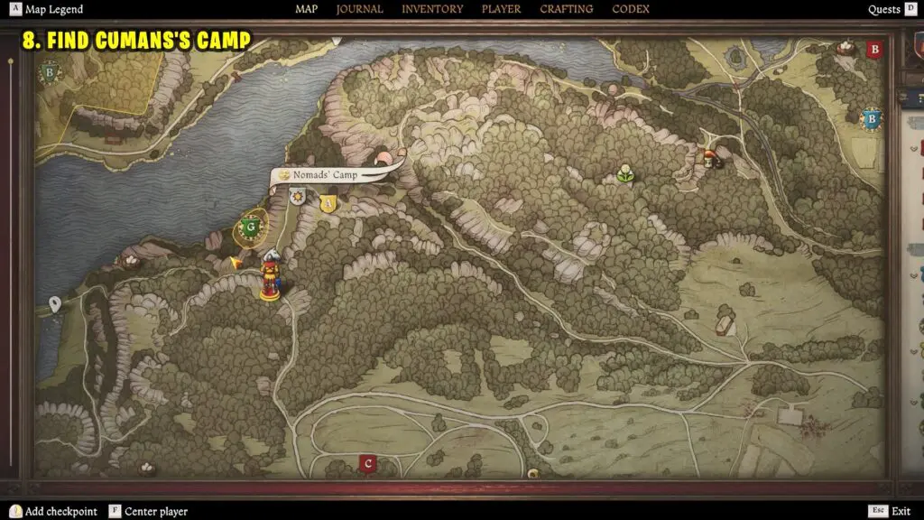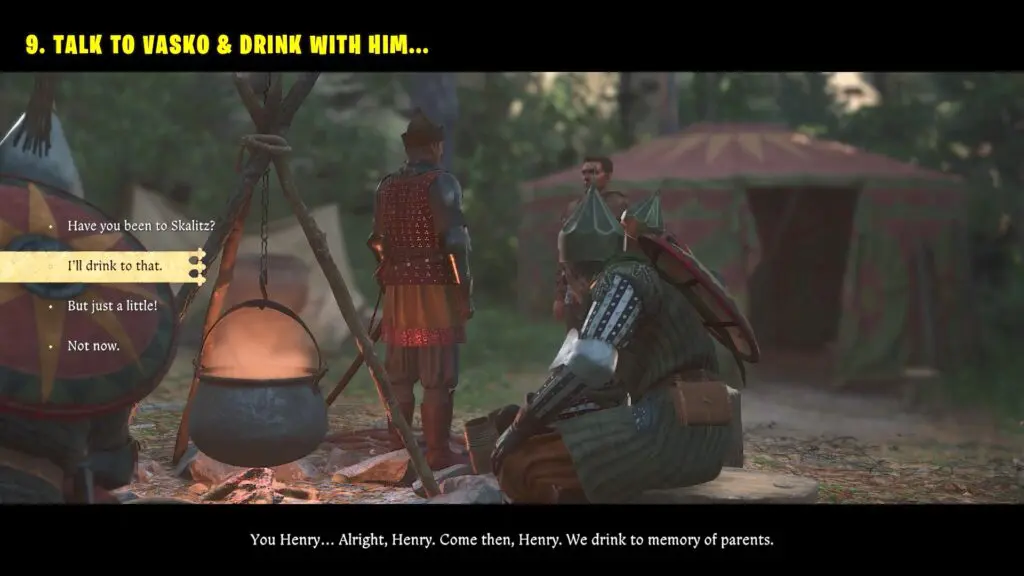 Next, head to the Cumans’ camp, located southwest of the Nomads’ camp near the pond. Once there, speak with Vasko and warn them not to visit the traven again where the fight breaks out then have a drink with him.