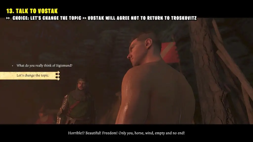 Return to camp with the booze and speak with Vasko. You’ll need to pass a few more speech checks. Along the way, you’ll find yourself in the middle of the pond and a few more cutscenes.