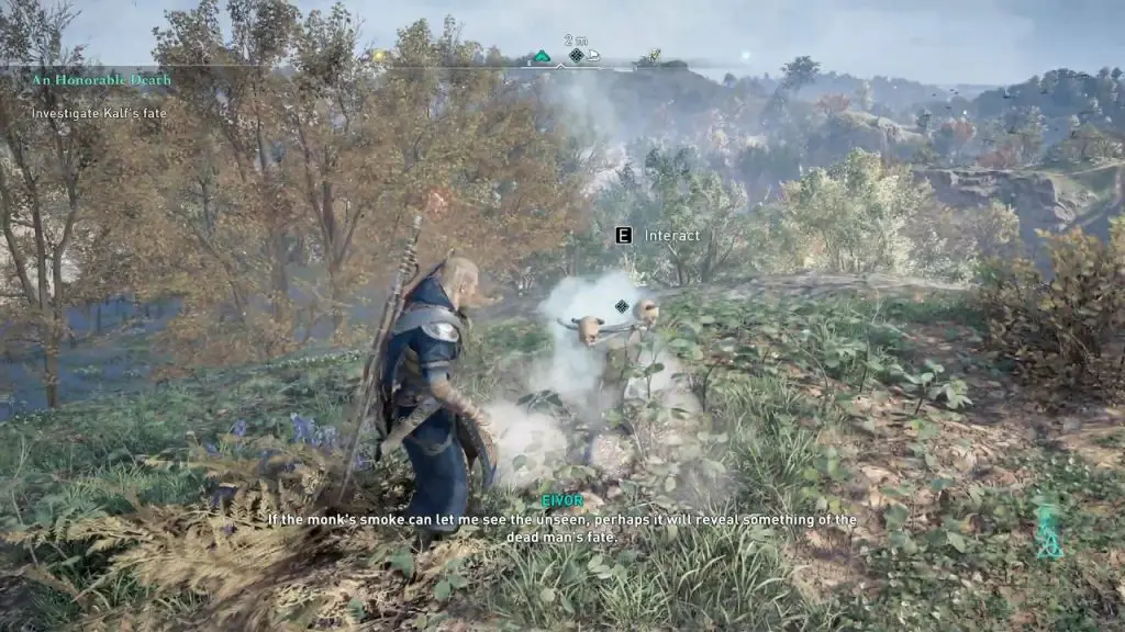 The objective will start after you have found Kalf’s Camp at the top of the cliff at the location as shown in the picture below. On reaching the camp, interact with the Smoking Pot (see the second picture below). Monk’s Smoke will help you see the unseen and help you uncover the story of the mysterious stranger.