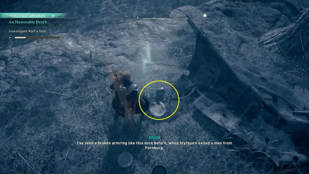 After interacting with the campfire, jump down the cliff. Then go south and you will find a broken armring near the shore as shown in the picture below. This investigation point is on the north side of a boat in the river (See the second picture below). You can easily see the boat in the river. Once you have spotted the boat, it will be very easy to find this investigation point.