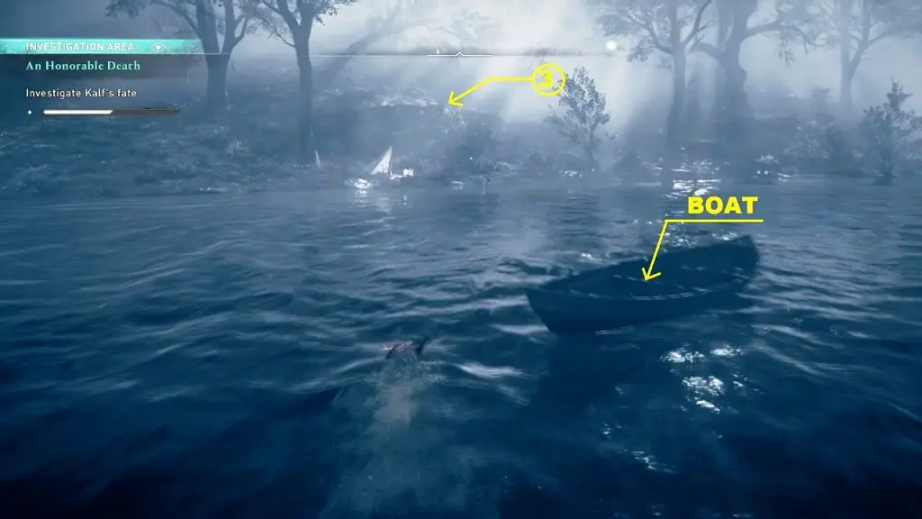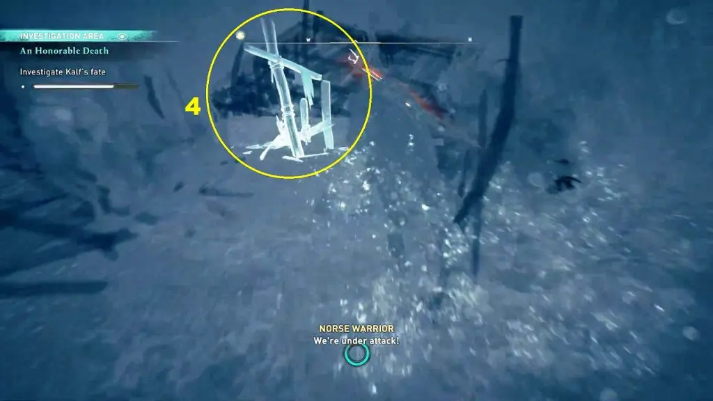 The final investigation point is underwater, on the west side of the boat. Above this investigation point, you will see some wooden logs floating on the water. Dive down and interact with the burnt remains of a longship bow to complete the investogation.