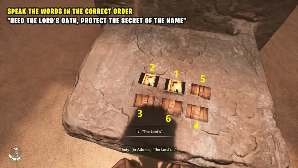Place these 6 photos in front of the statue. You have to touch each photo in the correct order to complete the sentence: “Heed-The Lord’s-Oath-Protect-The secret-Of the name“. Read the sentence correctly to end the puzzle.
