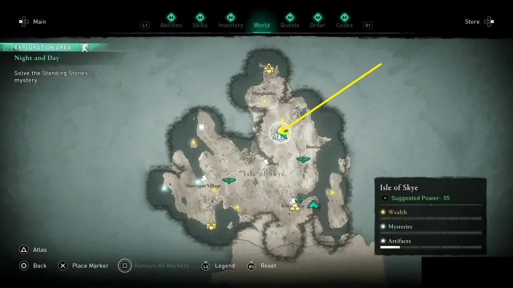 During the ‘Day and Night’ day and night quest, you will have to solve a Standing Stone puzzle at Fairy Glen, which is at the northern part of Isle of Skye as shown in the picture below.