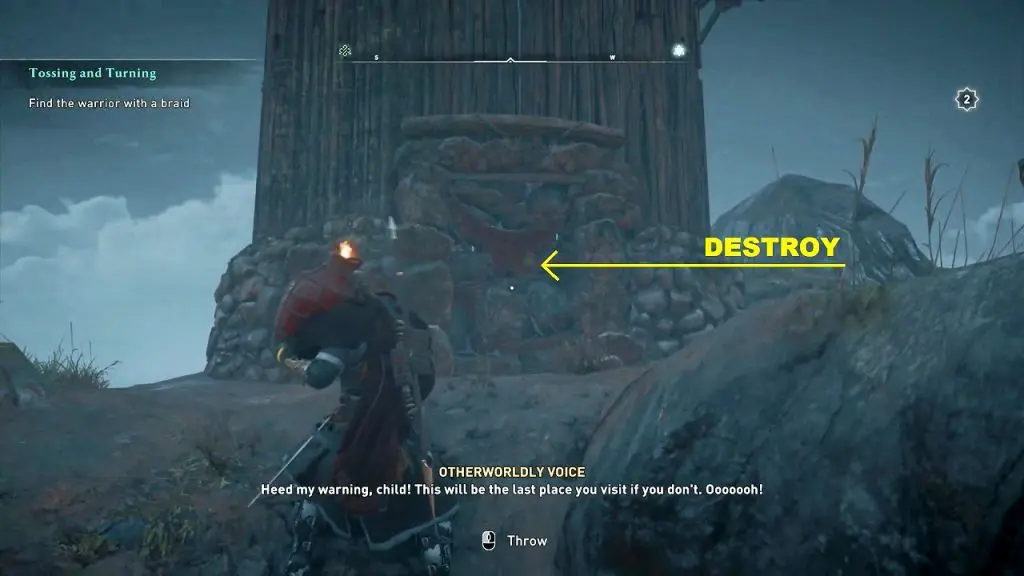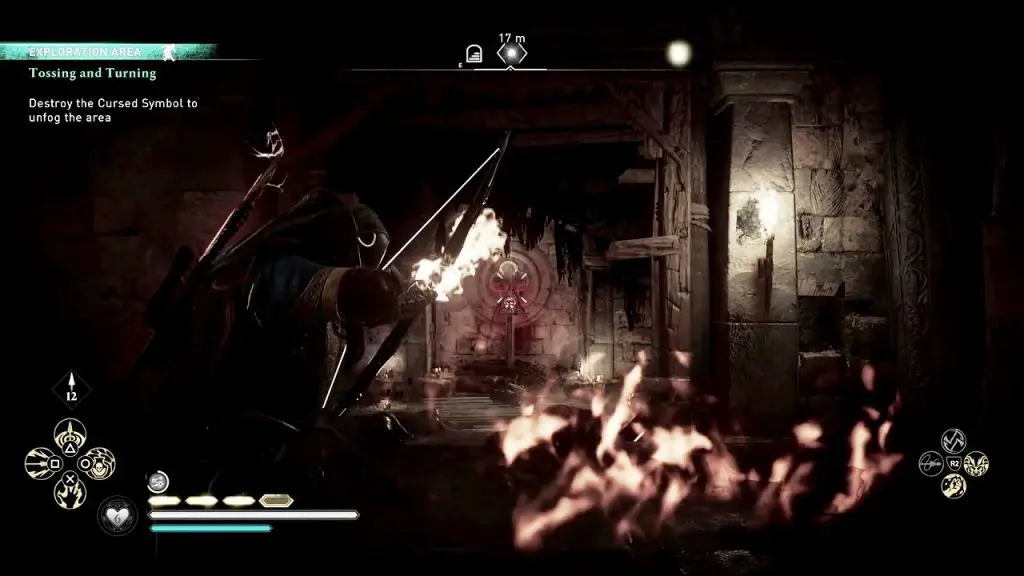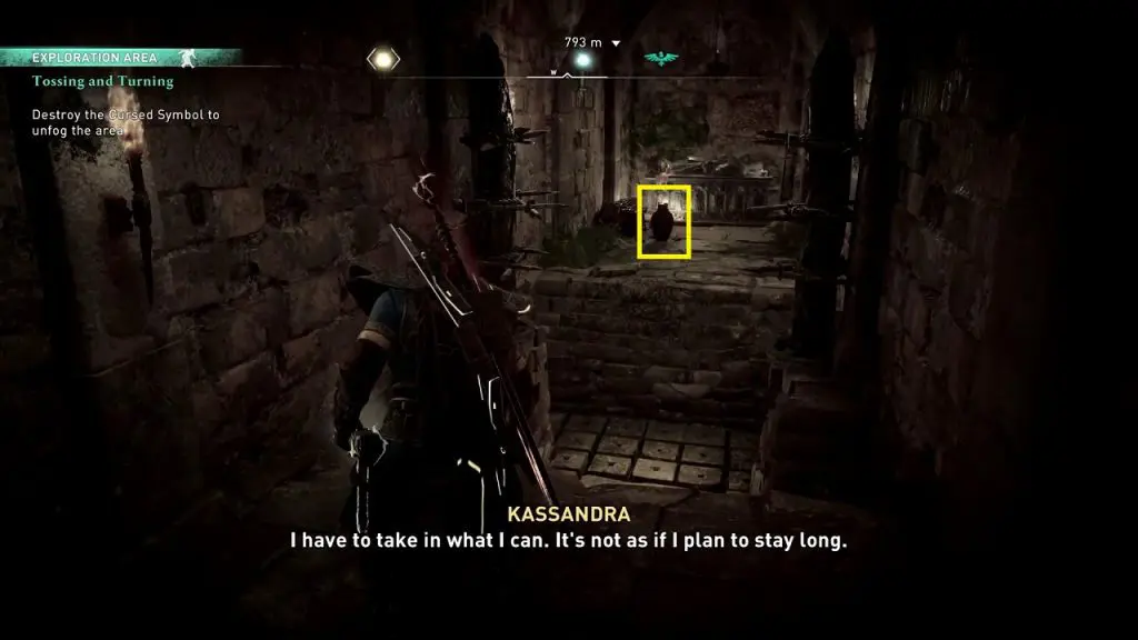 Pick up the explosive barrel. Then go out of the room and destroy the breakable wall nearby. Inside, you will find the cursed symbol. Destroy it to complete the objective.