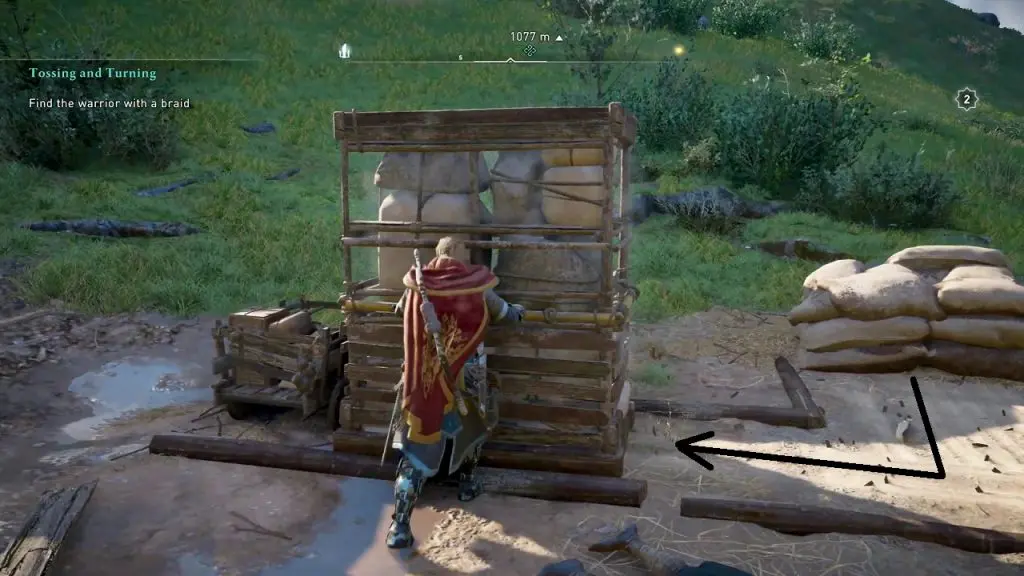 This chest is buried in the ground near a white tent in Isay bandit Camp. South of the tent, you will find an explosive barrel at the location shown in the picture below. Pick up the explosive barrel and carry it to the wealth location. Use the explosive barrel to destroy the ground above the chest. Then jump down the hole to get the wealth.