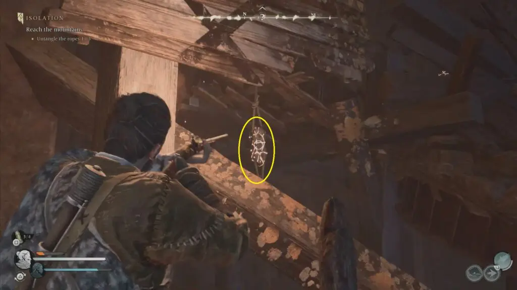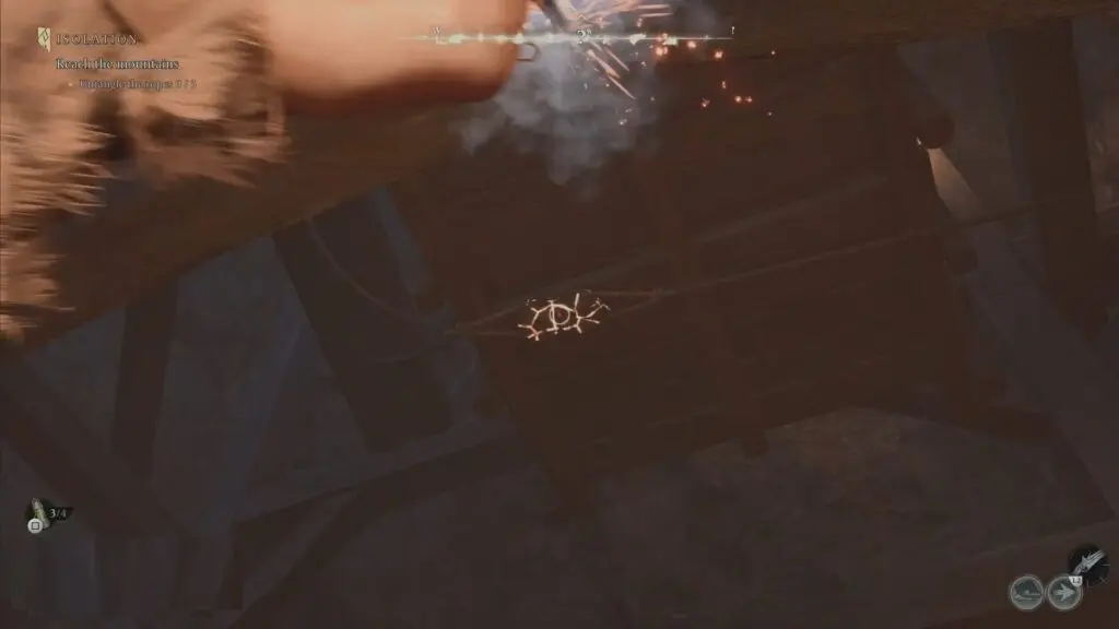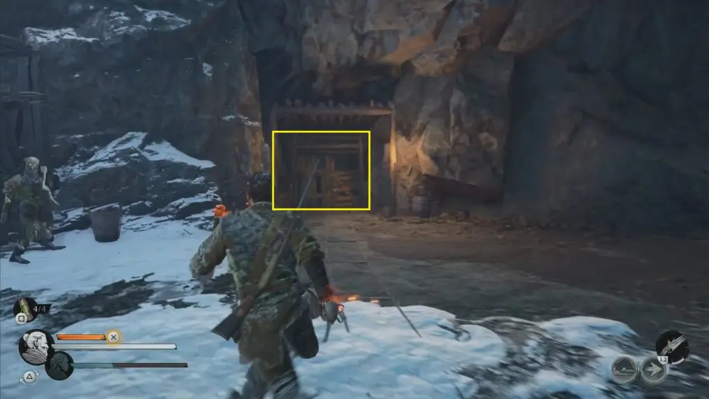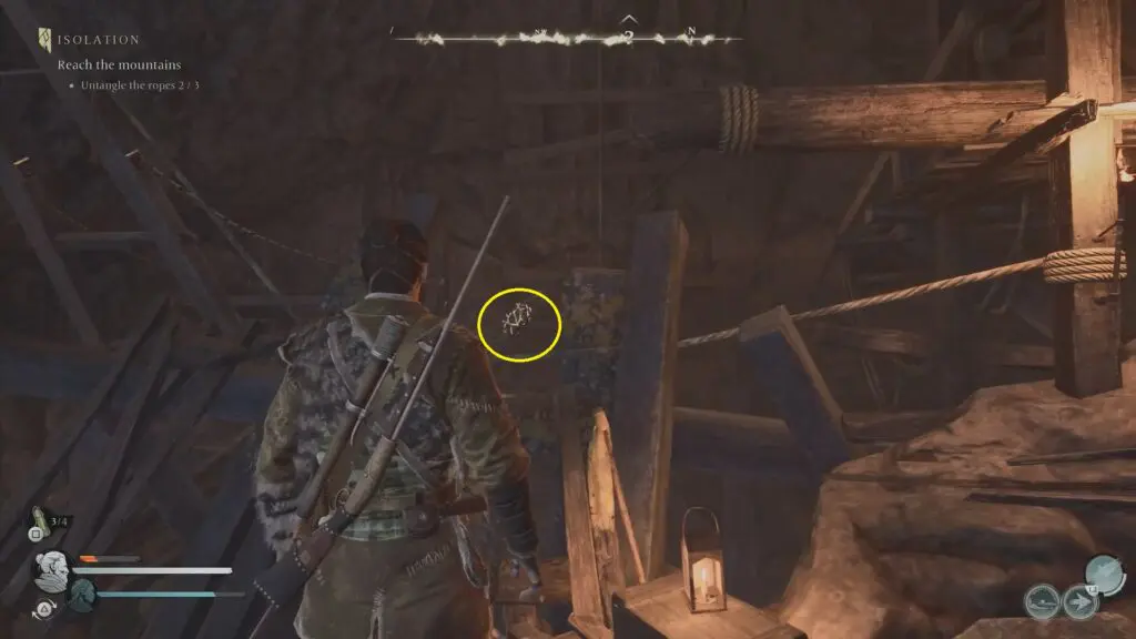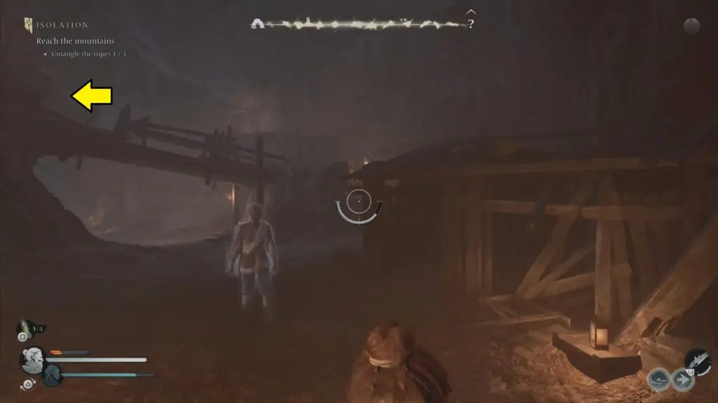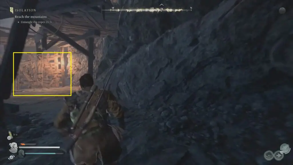 You will be inside a cave at the start of the quest. To reach the mountains you need to fix an elevator by destroying three sections of rope.
