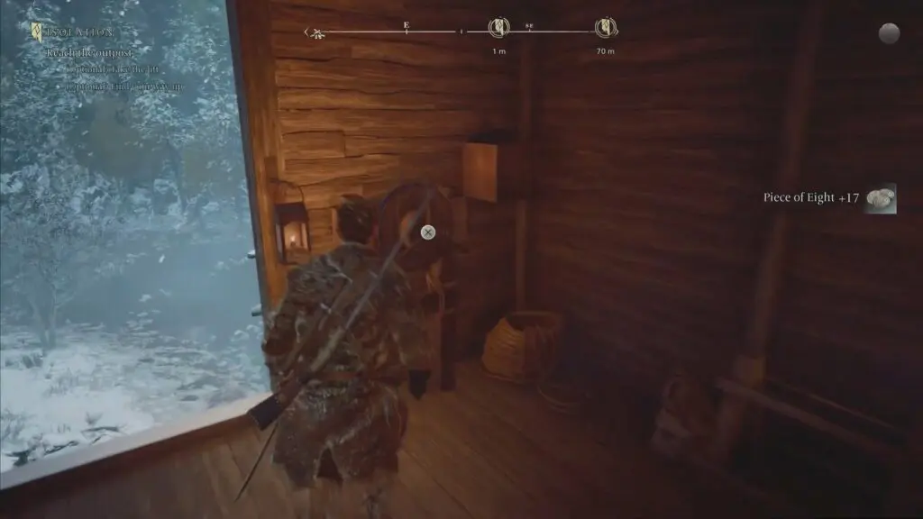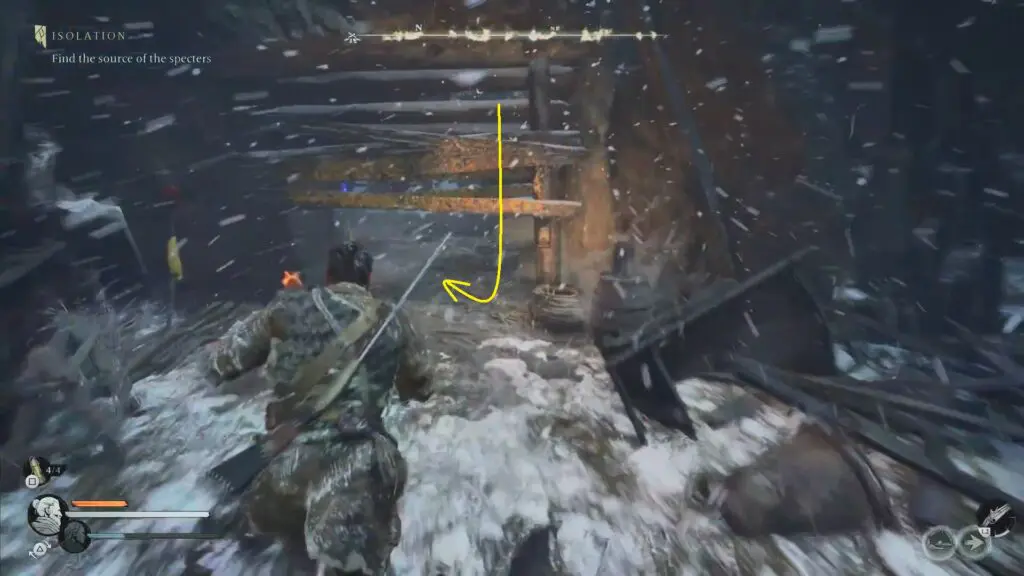 Go to the right side of the cabin and enter the crack where you can see the ghost calling you.