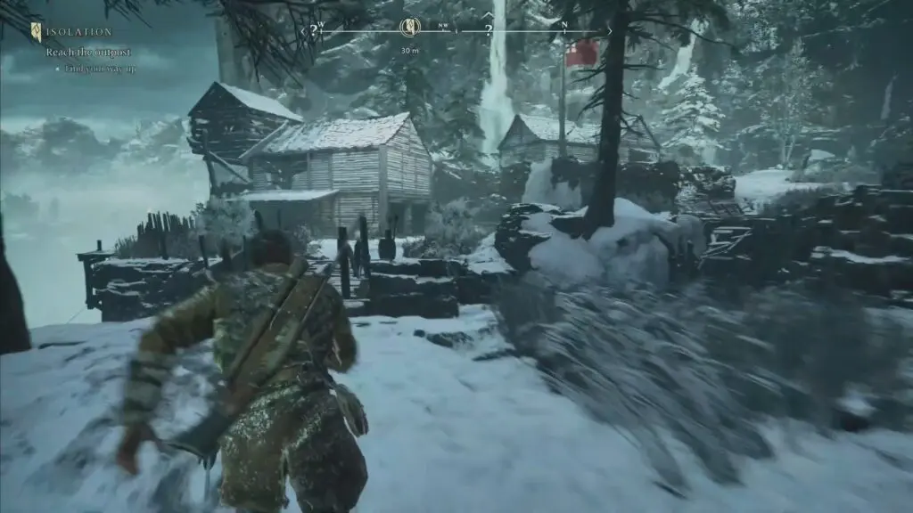 Follow the path, climb the walls at the end of the path, and a few more walls to reach the outpost and some cabin.
