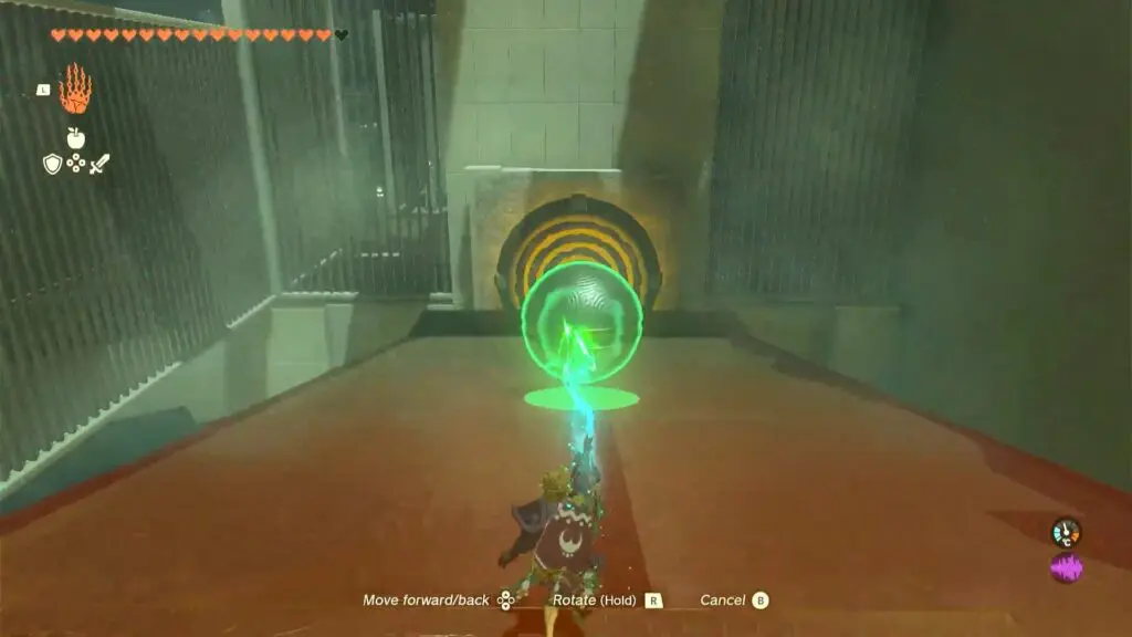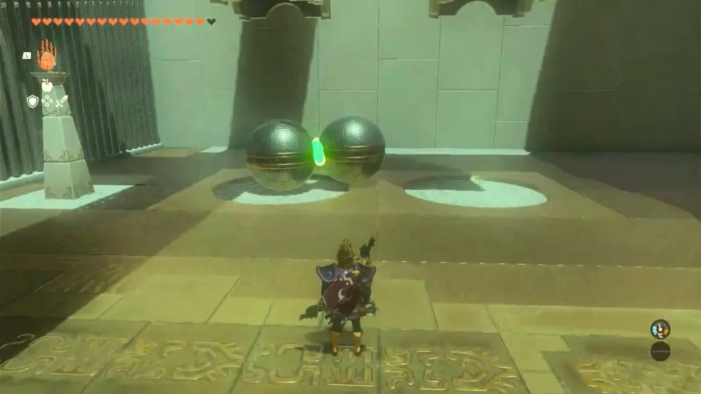 Upon entering the Iun-orok Shrine you will find a descending ramp with an orange target at its end. Adjacent to the ramp, on your right is a ball lying on the floor. To solve the first portion of the puzzle, use Ultrahand to grab the ball and place it on the ramp, aligning it precisely so that the ball rolls down the ramp to hit the orange target situated at the bottom of the ramp.