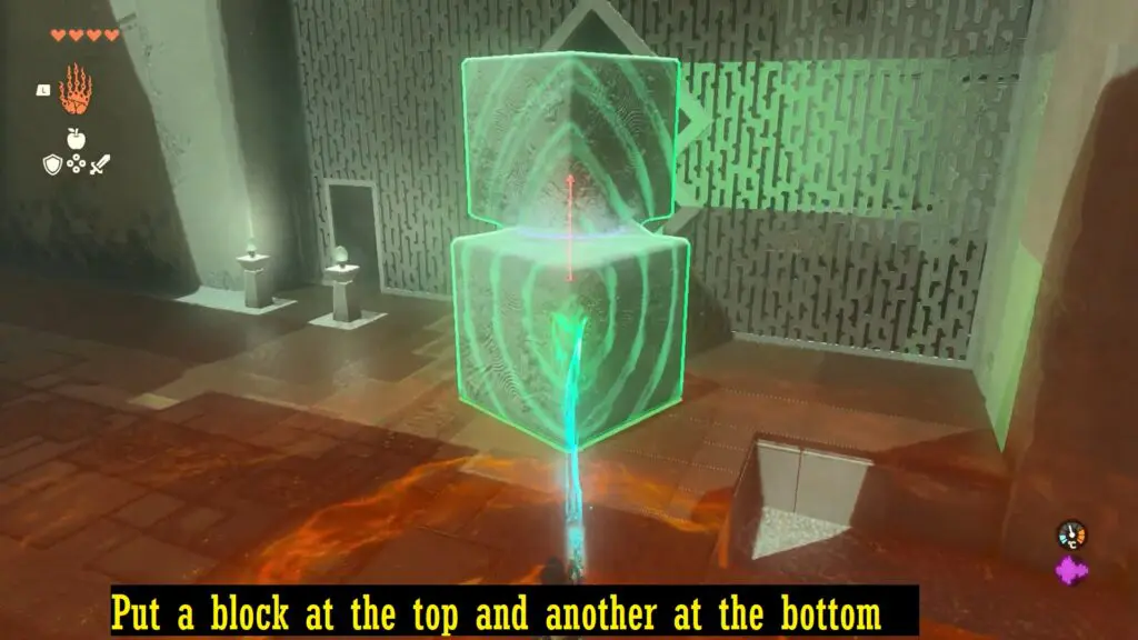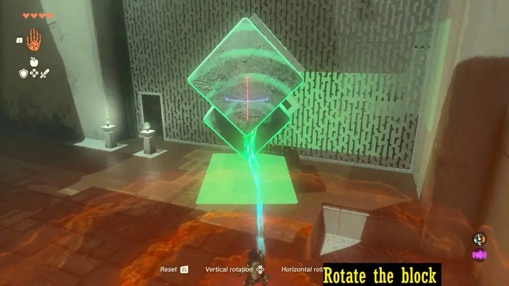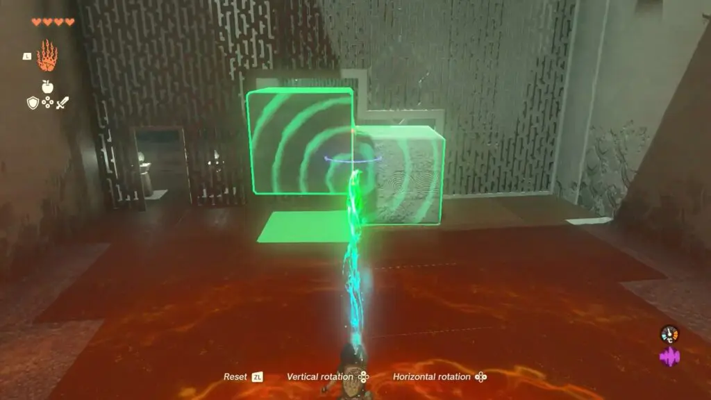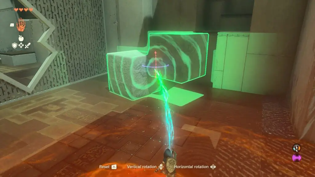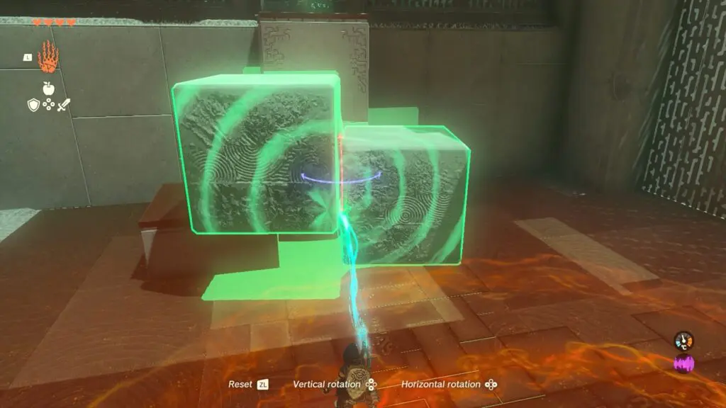 In the next section, go to the right-side room and use Ultrahand to pick up the object made up of two cubes. Rotate it to pass through the hole in the wall.