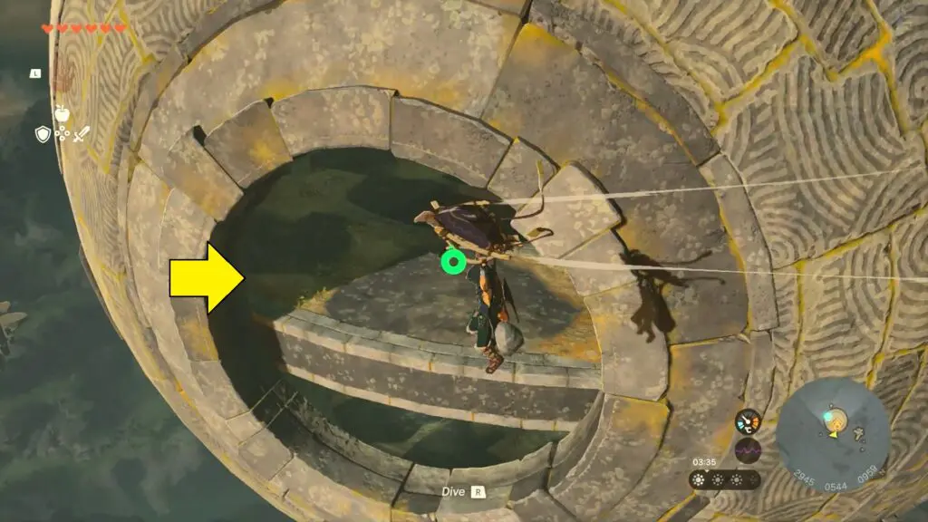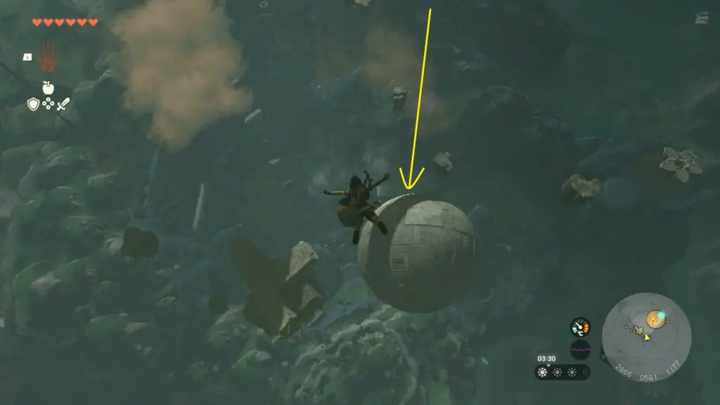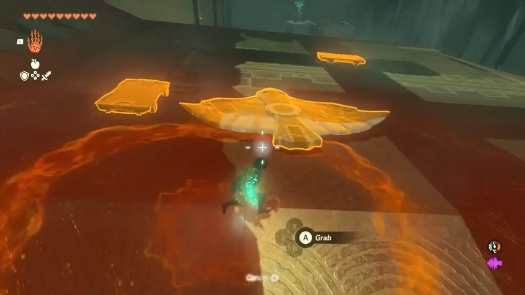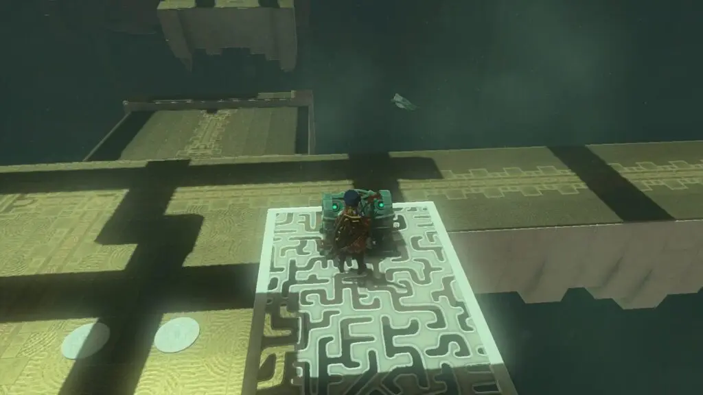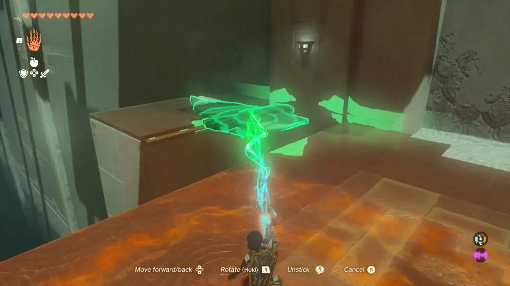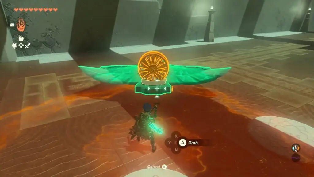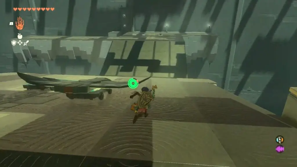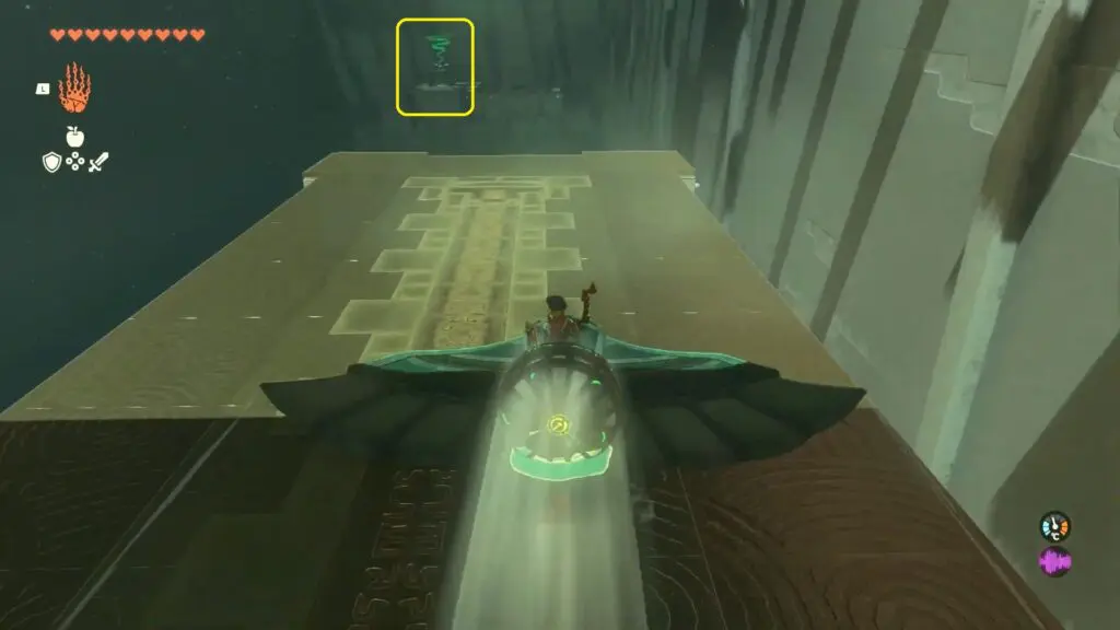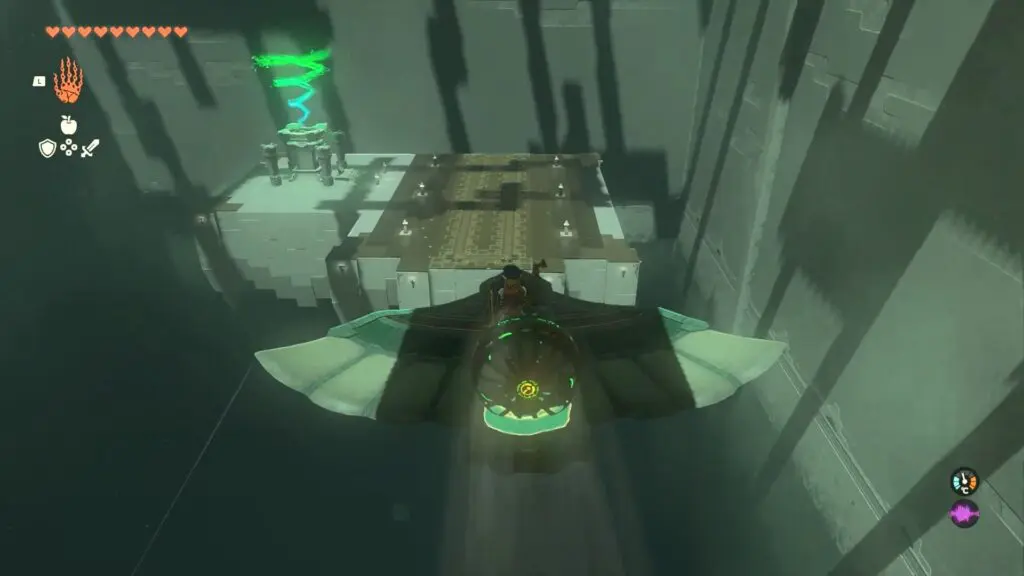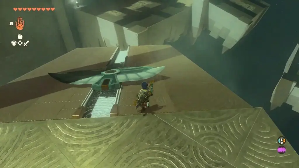 In the Jirutagumac Shrine’s final puzzle, you’ll need to glide over a longer distance. Begin by attaching the fan to the glider and then hitting the fan to set the glider in motion.
