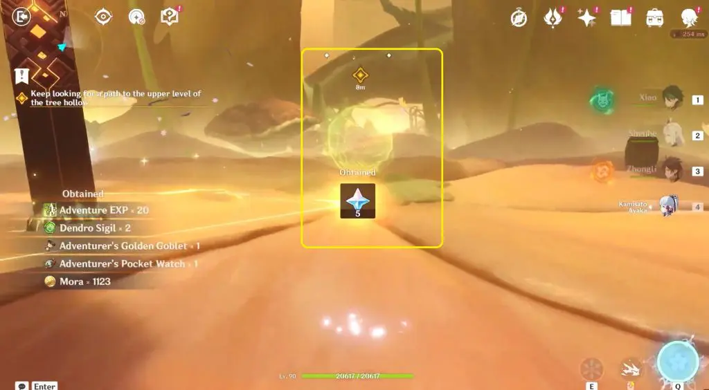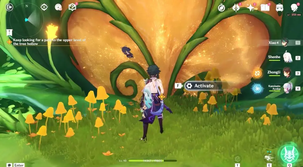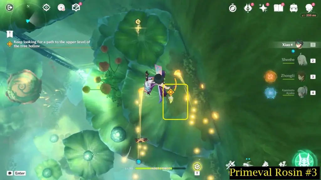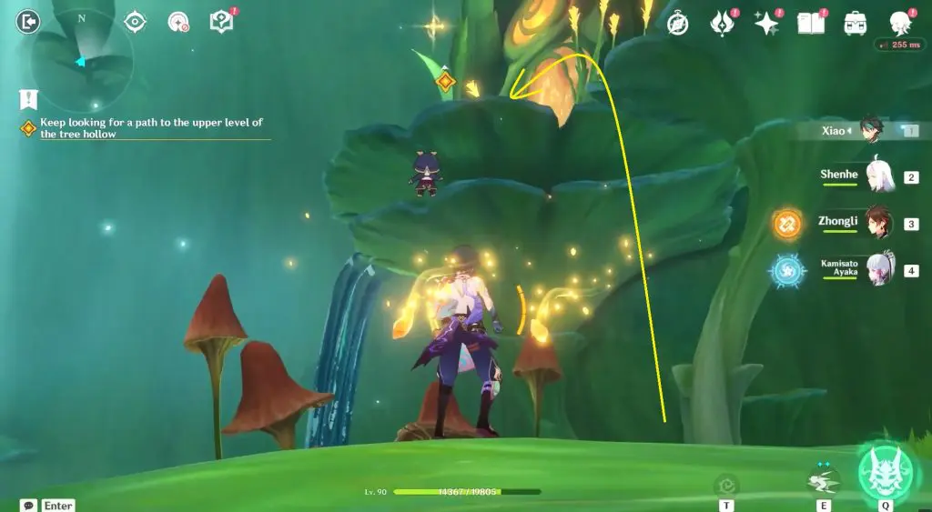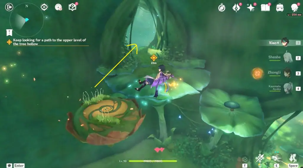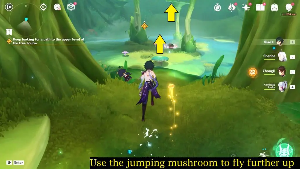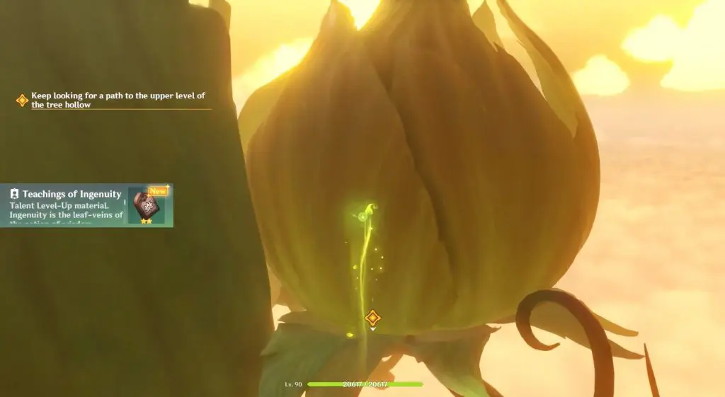 Continue to follow tree hollow and eliminate a Mitachurl and a group of other opponents. After defeating all the opponents, interact with the yellow cloud as seen in the below picture. This yellow cloud will lift you further up to another flower at the top.