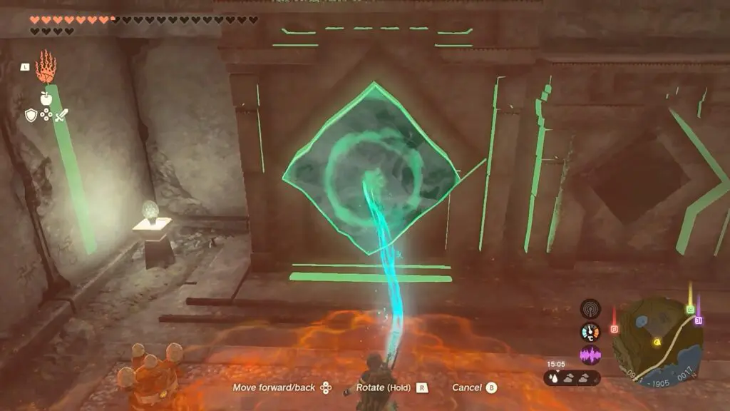 Go back to the river and throw an Ice Fruit into it to form an ice slab. Decrease the size of the ice slab on the campfire. Then insert the ice slab into the third altar as shown in the picture below.