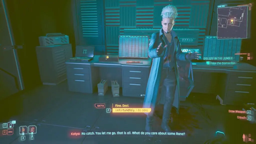 Players opting to let go of Katya will be rewarded with Bana’s biomonitor, a crucial item for progressing in the Phantom Liberty DLC gig. The player will also get details information regarding her hidden cache tucked away in Dogtown. Stash contains 8,500 Eurodollars, a face piece that reduces quickhack upload time, and the quest Money For Nothing, which triggers when the player makes a pact with Katya.