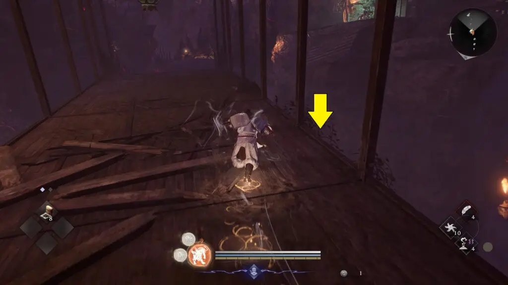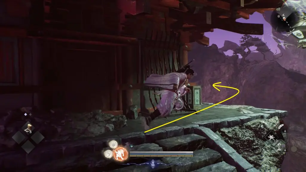 Climb the stairs and walk to the middle section of the bridge. From there, carefully drop down onto the ledge below. After landing, move underneath the bridge. Follow the space below the structure, and you will find the Kodama hidden there.