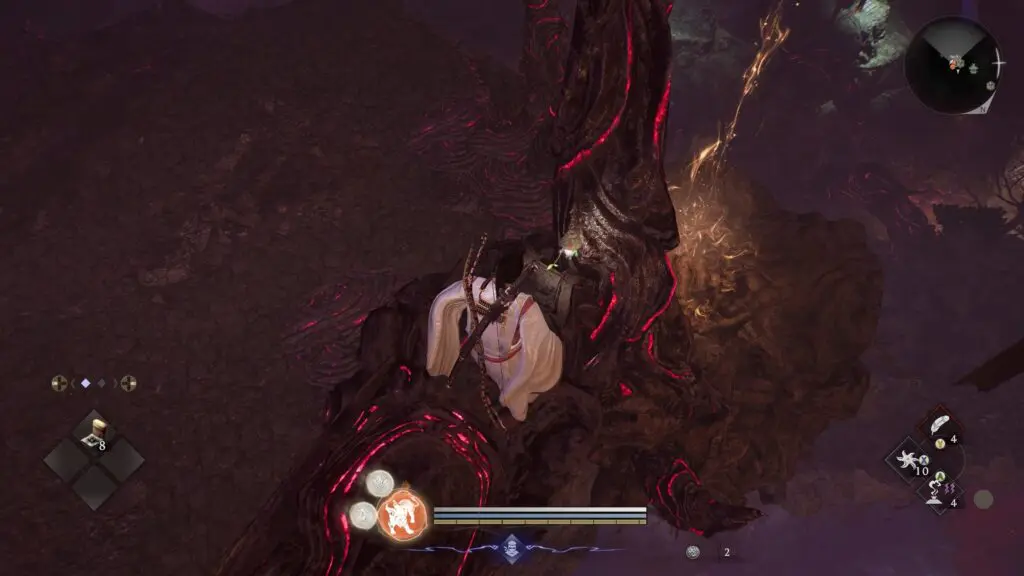 Activate the Spirit Vein and use it to move up to the higher level. After reaching the upper section, look over the edge of the ledge. You should be able to see the Kodama below. Carefully drop down onto the ledge near it and collect the Kodama.