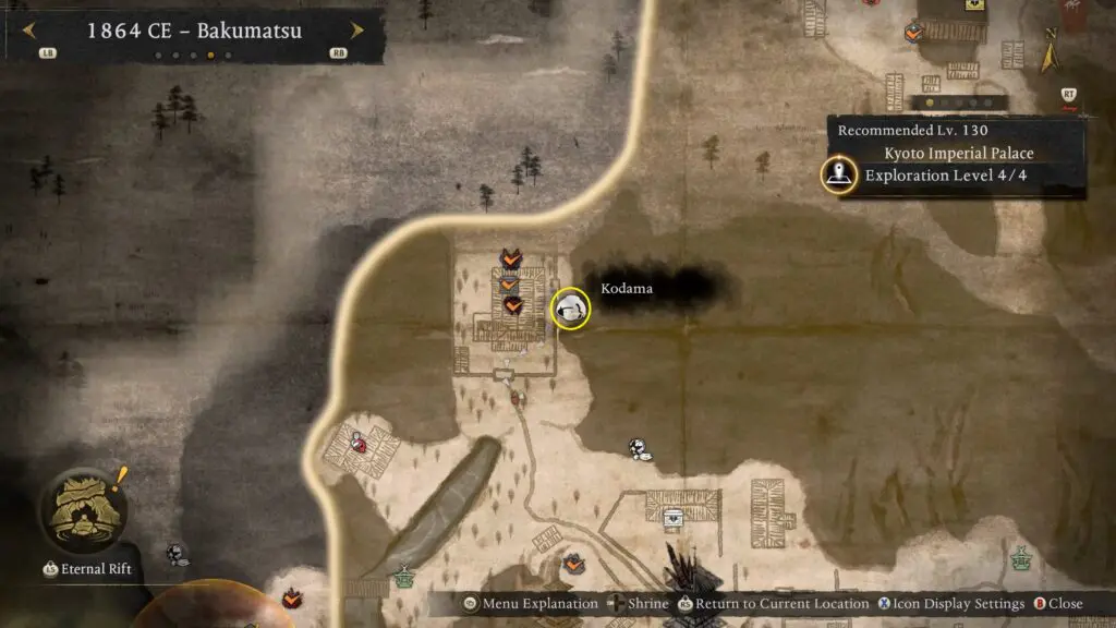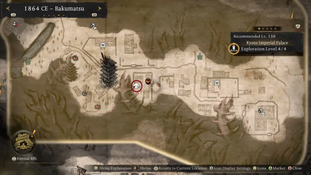 Fast travel to the Imperial Palace fast travel point in the Kyoto Imperial Palace area. From the starting point, face east and begin moving along the main path. Stay on this route until you see a clear left turn. Take this turn and continue forward toward the location marked on the map.