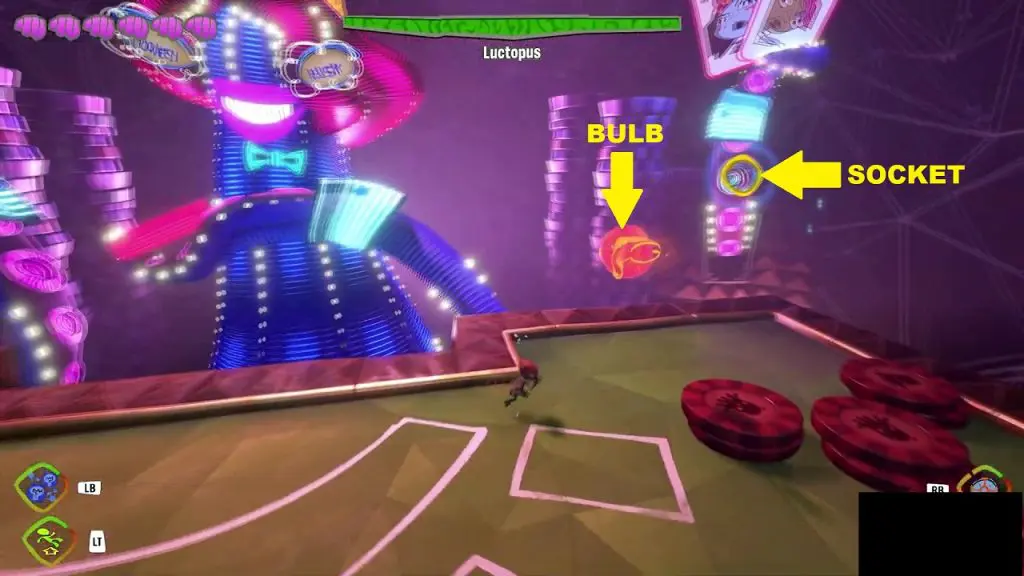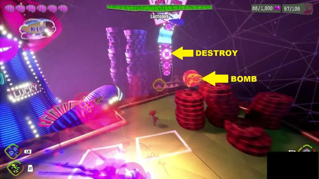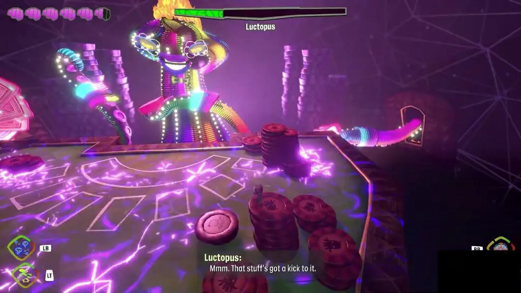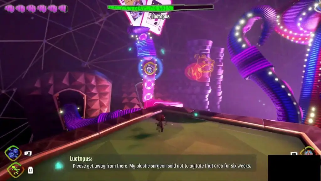 Lady Luctopus is the first major boss in Psychnaughts 2. You will face Lady Luctopus towards the end of the “Hollis’ Hot Streak” Brain/Level after you have gained access to High Roller’s Lounge. Lady Luctopus will be holding six cards. Each card will be having one captive each: Lizzie, Adam, Morris, Norma, Sam, and Gisu. Your objective will be to release all the captives and defeat Lady Luctopus. The fight has six phases.