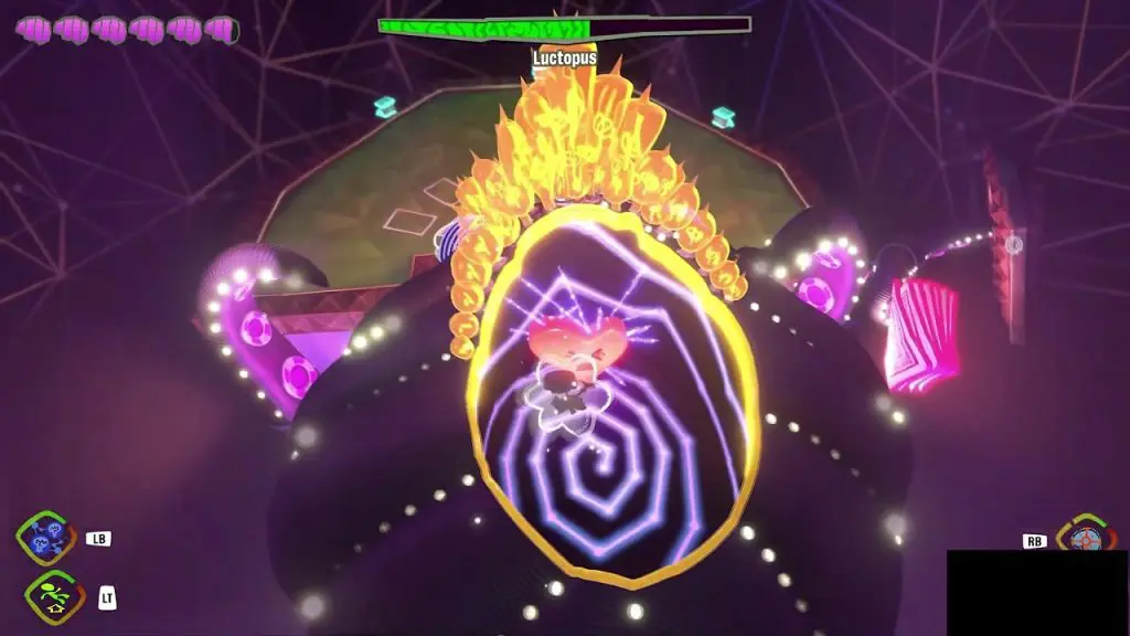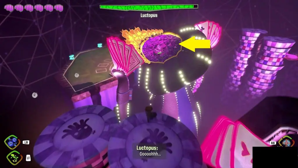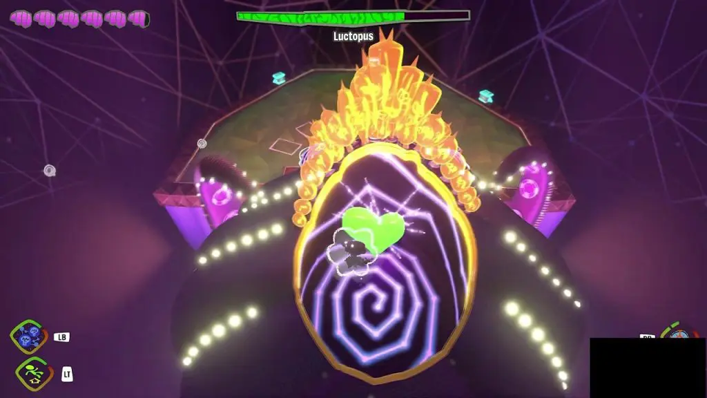 Destroy the purple barrier using PSI blast, reveal a Green Heart, and idea nodes to reach the top of the heart. Use mental connect on the nodes to reach the top of the Green Heart. Attack the Green Heart with PSI blast to deal damage to Lady Luctopus. After some damage, Lady Luctopus will wake up and throw you back to the platform in front of her.