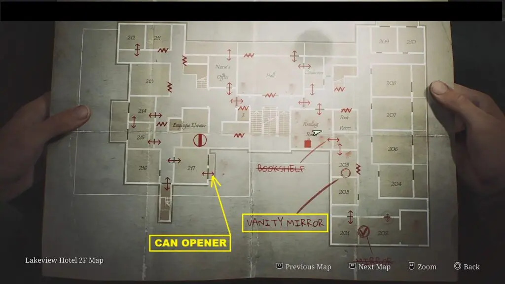This guide shows how to solve the Vanity Mirror Lightbulb Puzzle in the Lakeview Hotel area in the Silent Hill 2 game, which was released on 6th October 2024. The vanity Mirror is in room 205 on the second floor as shown in the picture below. You will reach there by solving the Bookshelf puzzle.