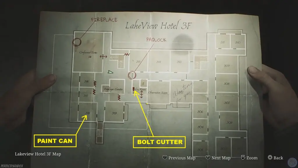 Get Bolt Cutter from the Utility Room on 3F and Paint Can from Room 318 on 3F as shown in the picture below.